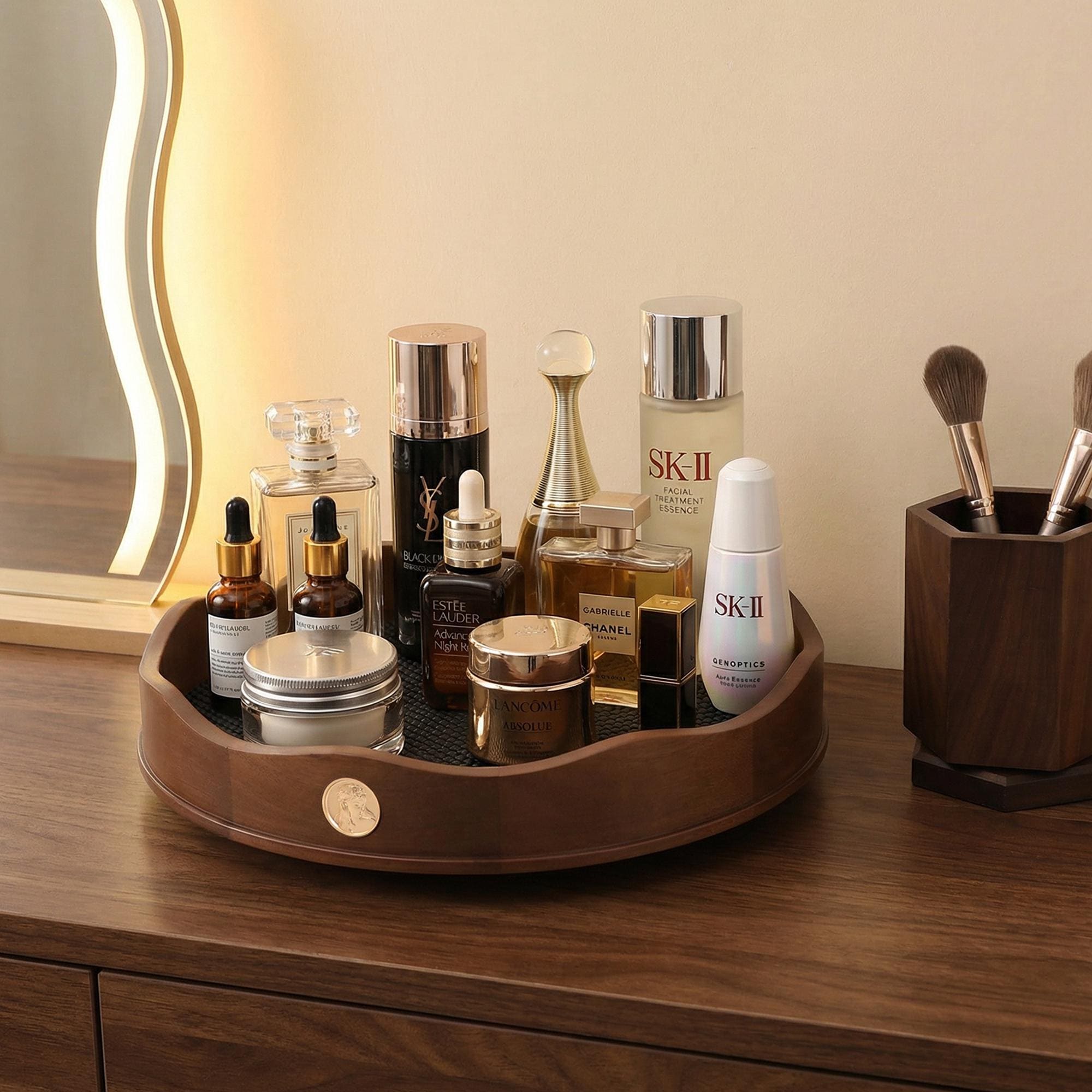 "An Elegant Rotating Cosmetics Storage Tray for Everyday Beauty This rotating Cosmetics Storage...