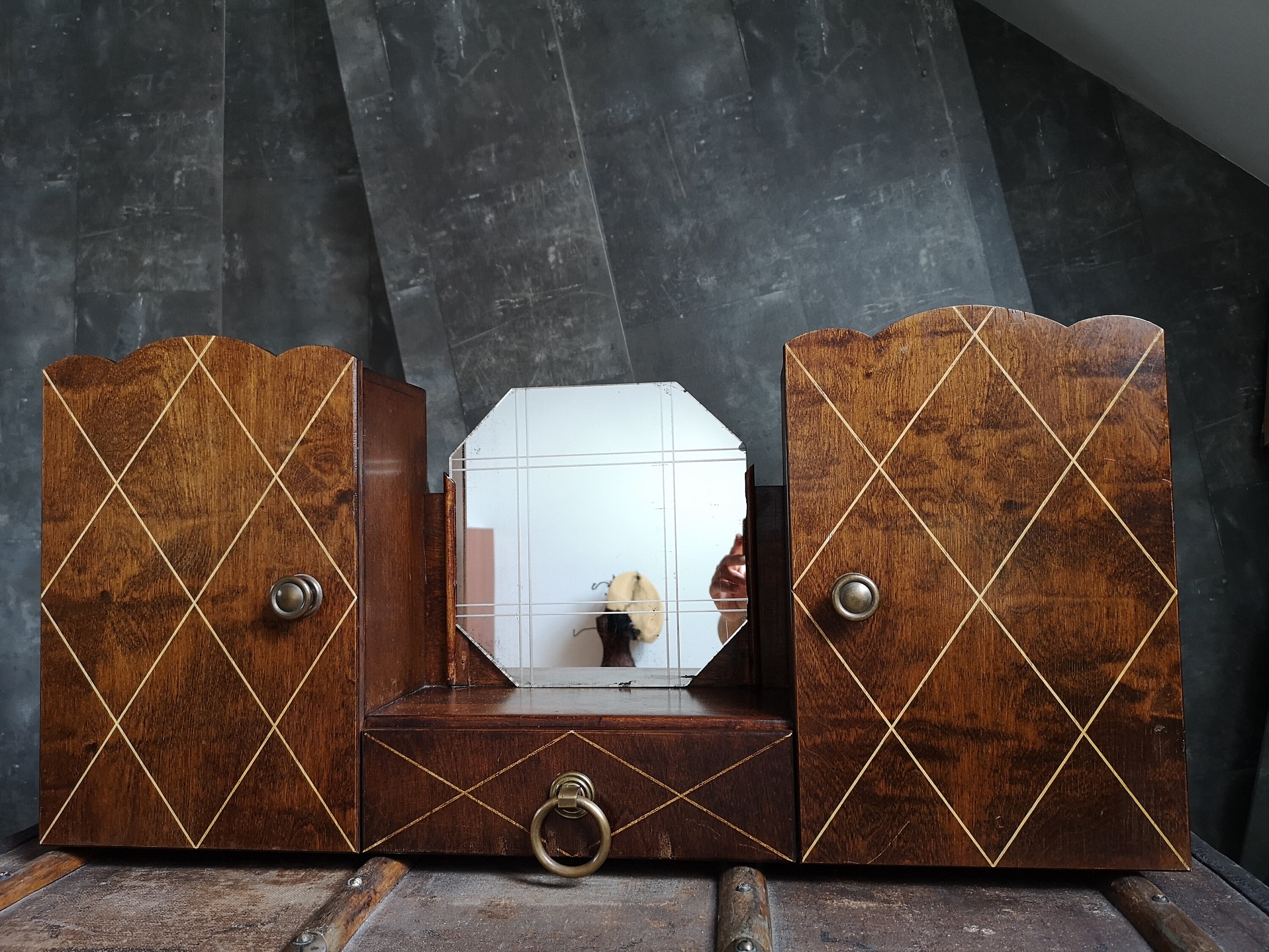 Bathroom or Pharmacy Cabinet with mirror and drawer. This Cabinet and mirror is rare of lined stripe...