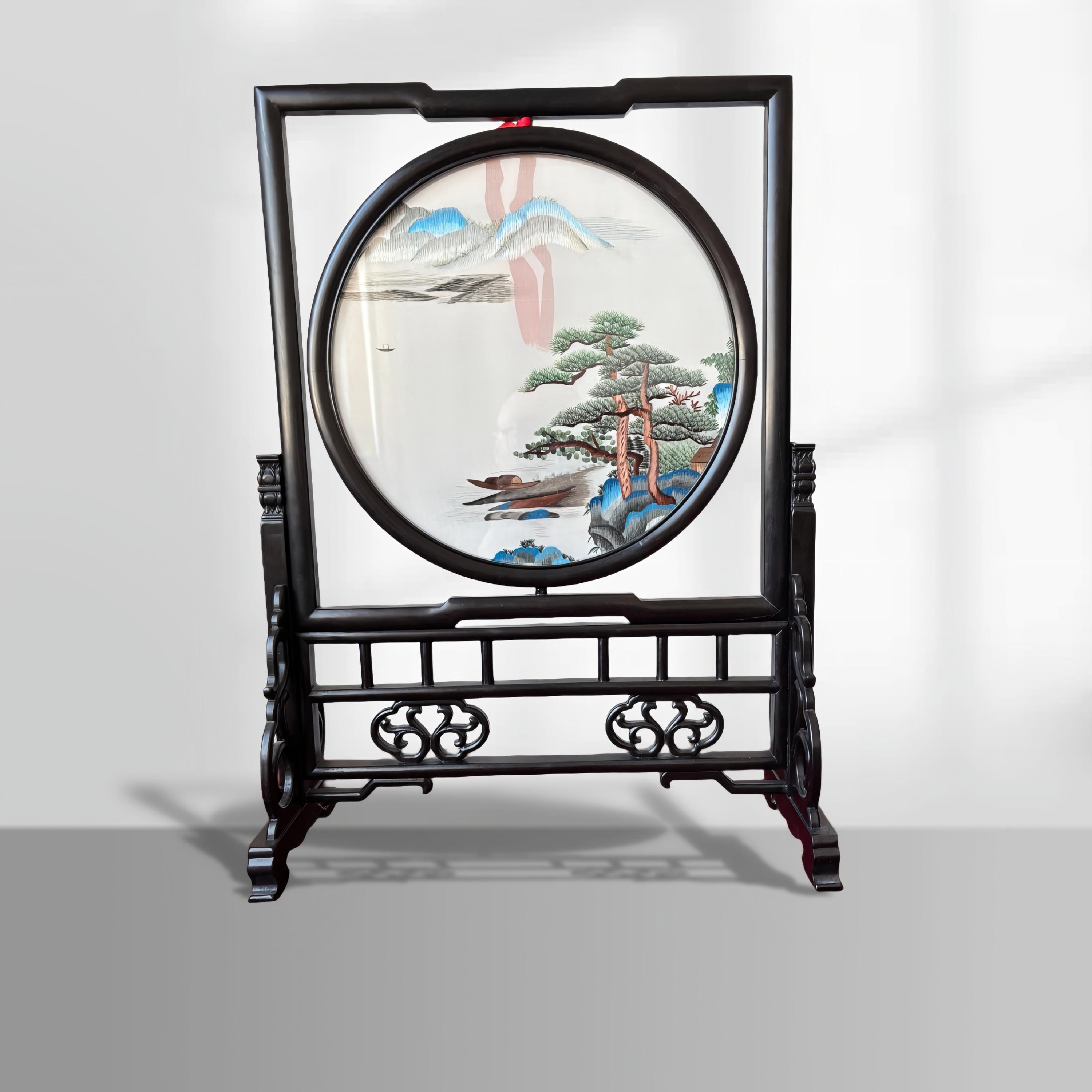 This image showcases a traditional Chinese table screen with intricate double-sided silk embroidery,...
