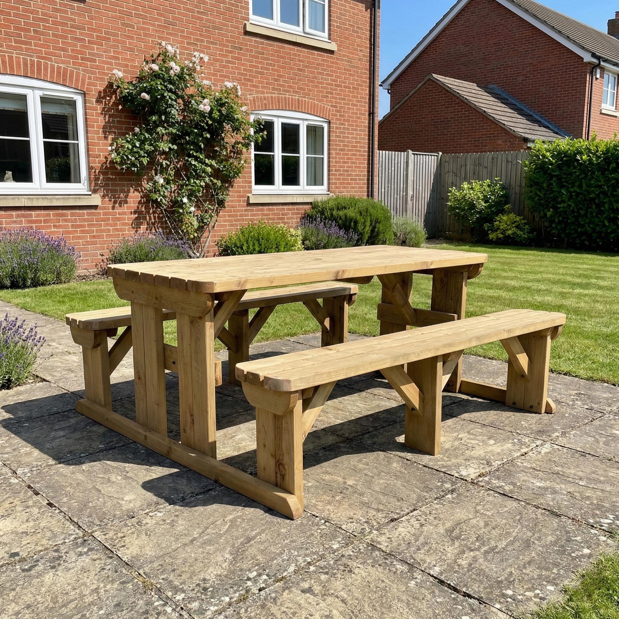 Abies Round Attached Wooden Picnic Table and Bench Set | Heavy Duty...