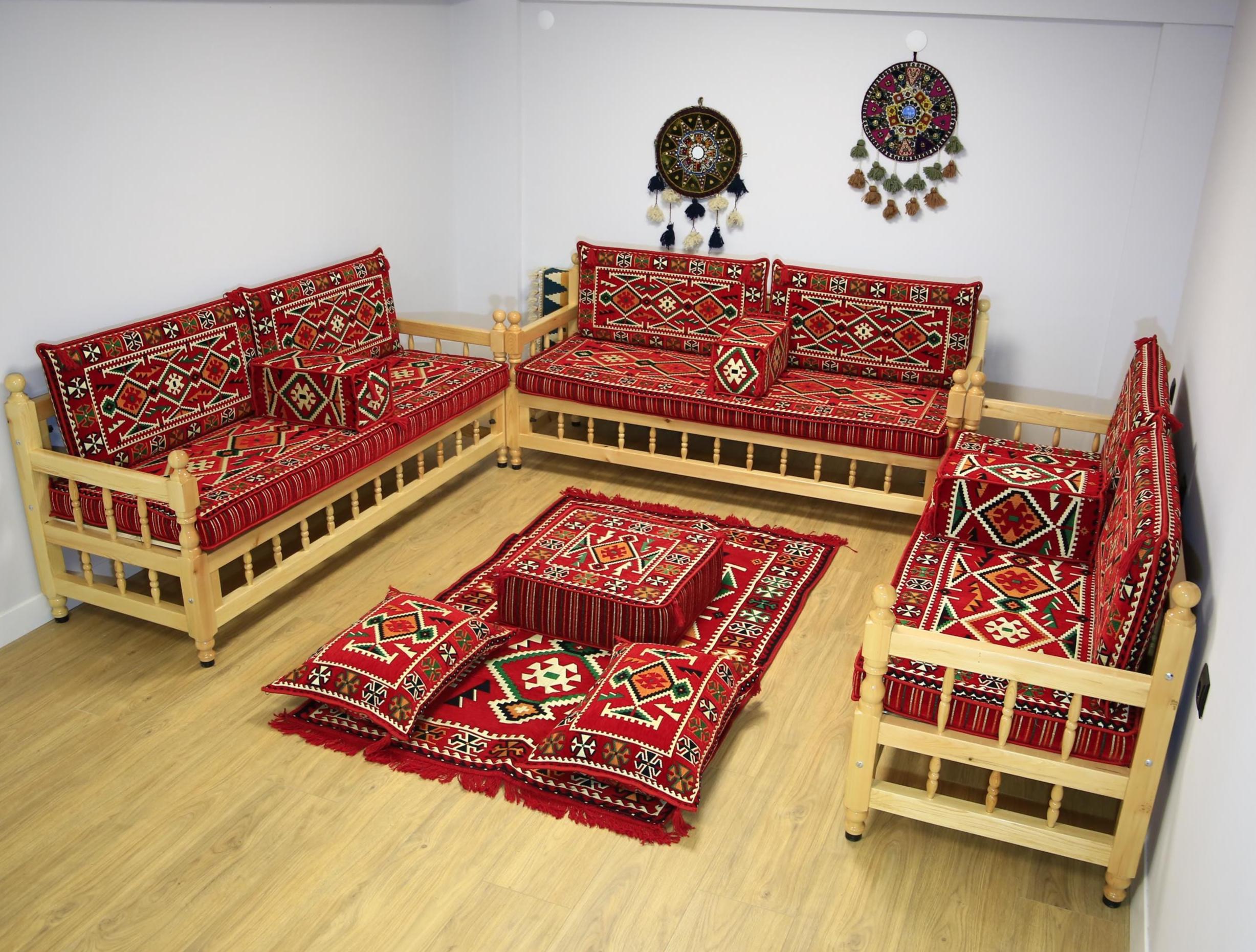 Red Rug Upholstered with wooden benches, Arabic Sofa, Ottoman Bench...