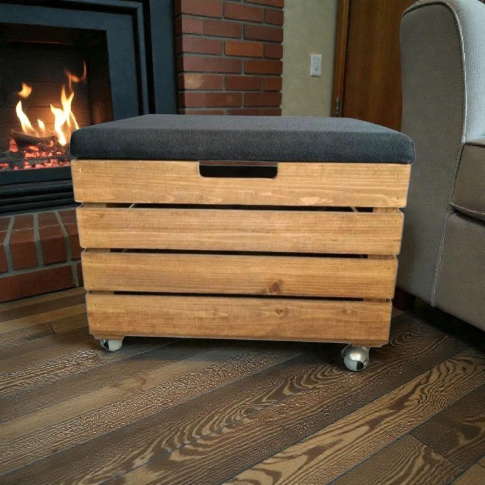 Wooden Storage Ottoman on Wheels, Rustic Pine Pouf with Cushion, Mo...