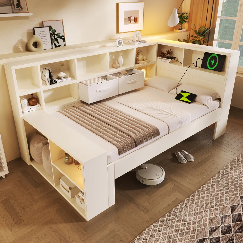 PINGGO 3FT Single Daybed with Storage USB Type-C Port Bookcase 90x190cm Wooden Platform Bed Frame Wh...