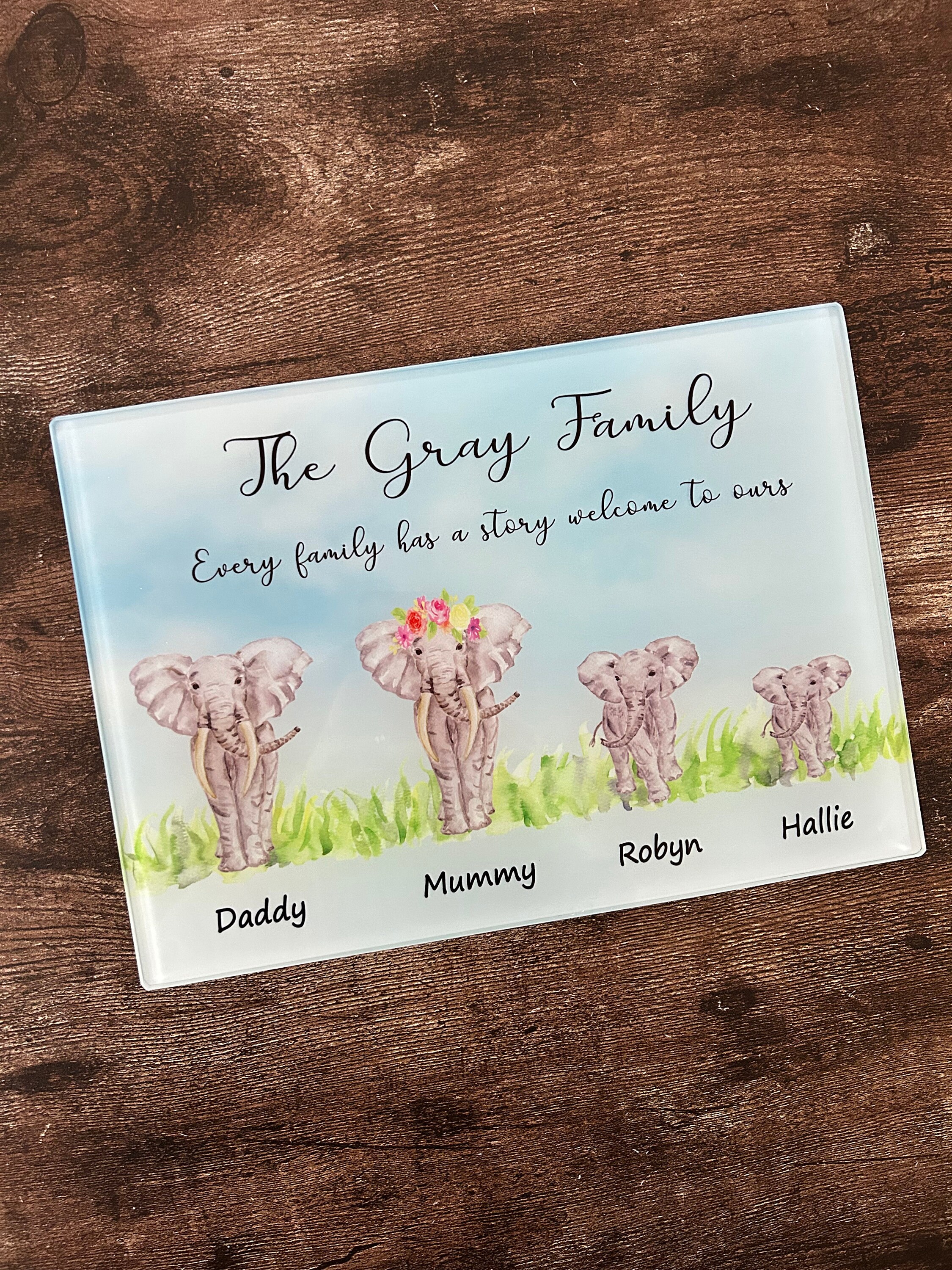 A lovely personalised elephant family glass chopping board. This makes the perfect gift for any occa...