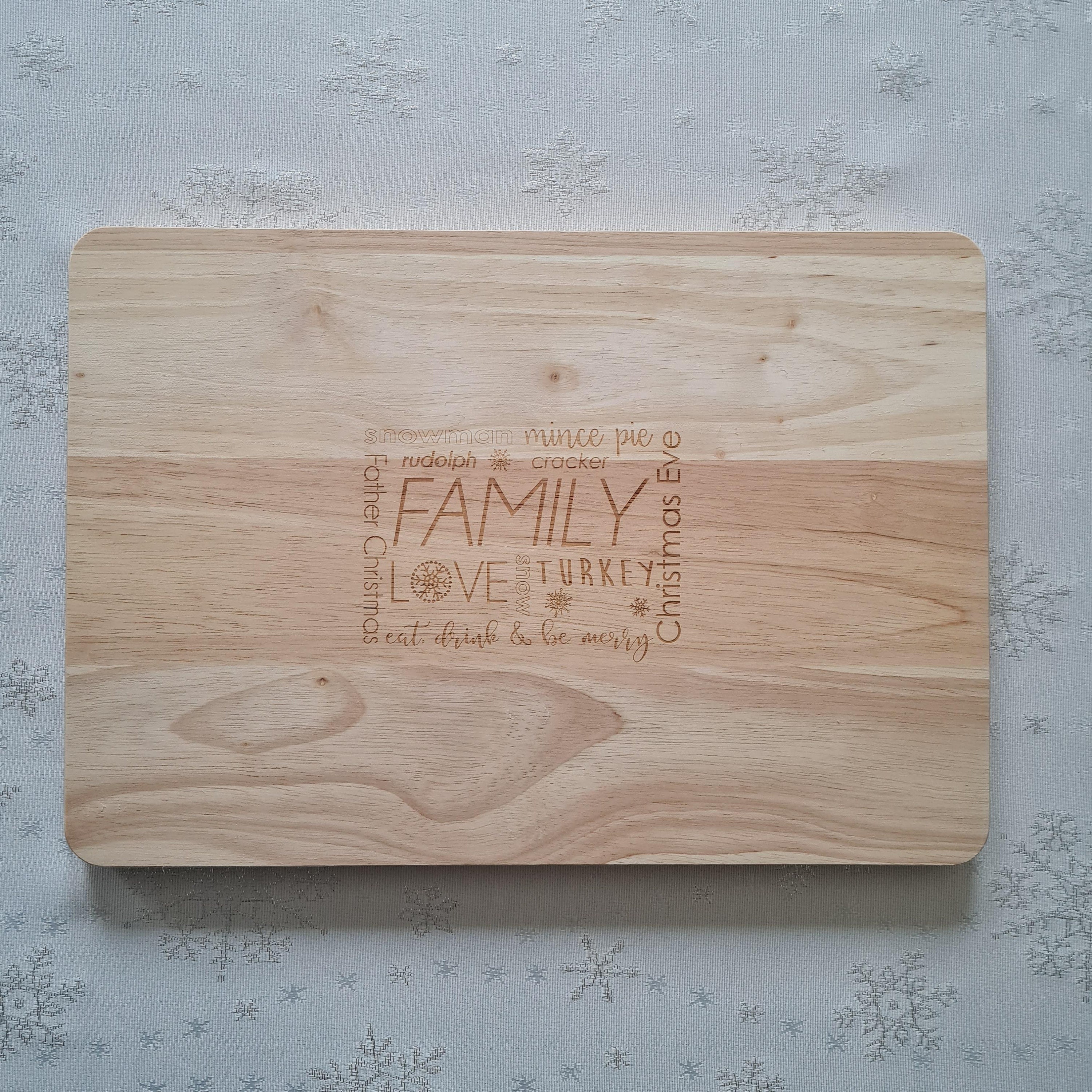Beautifully engraved wooden chopping board. Engraved with the word 'FAMILY' and Christmas associated...