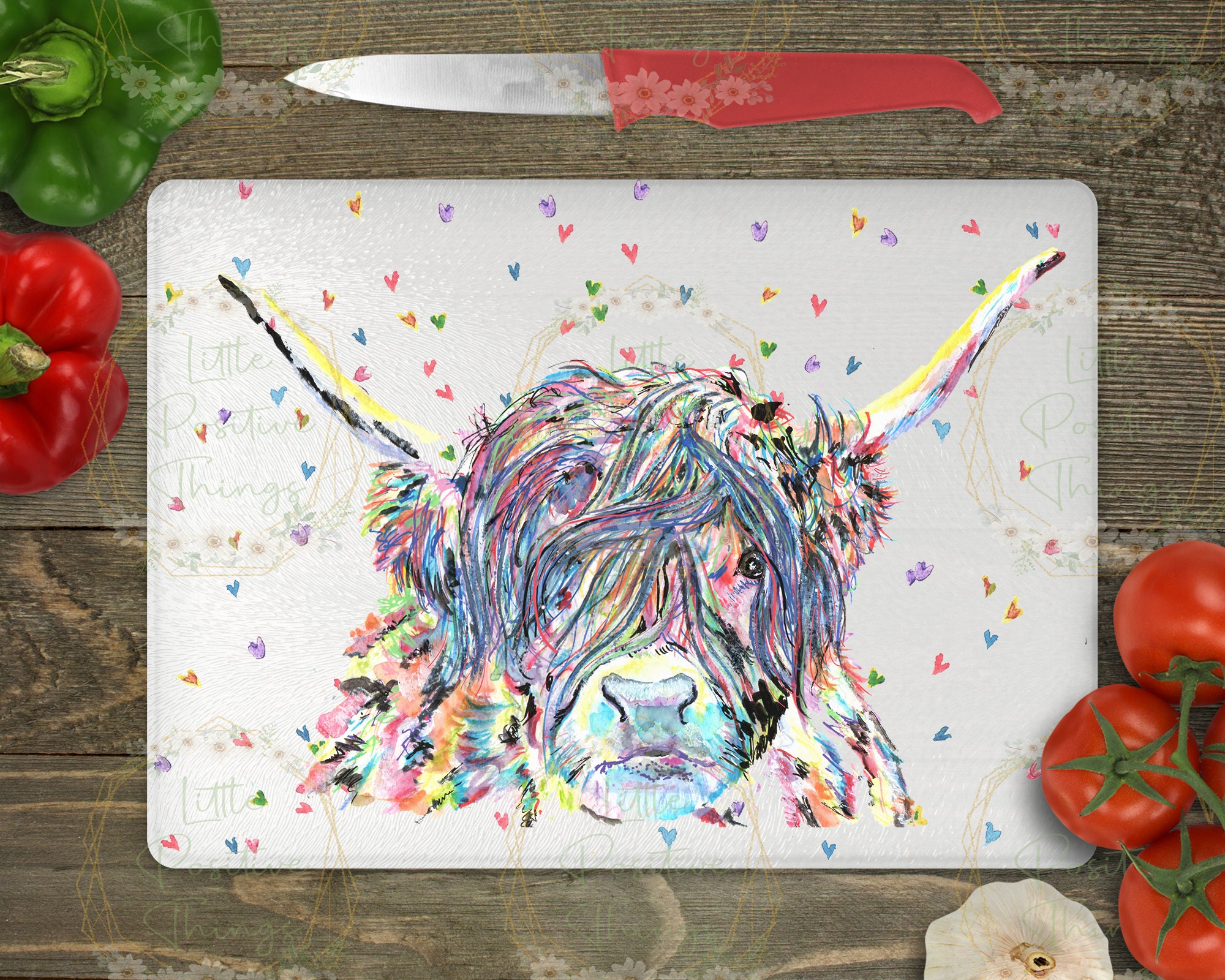 "Absolutely stunning watercoloured graphic chopping board Features a pretty highland cow and he...
