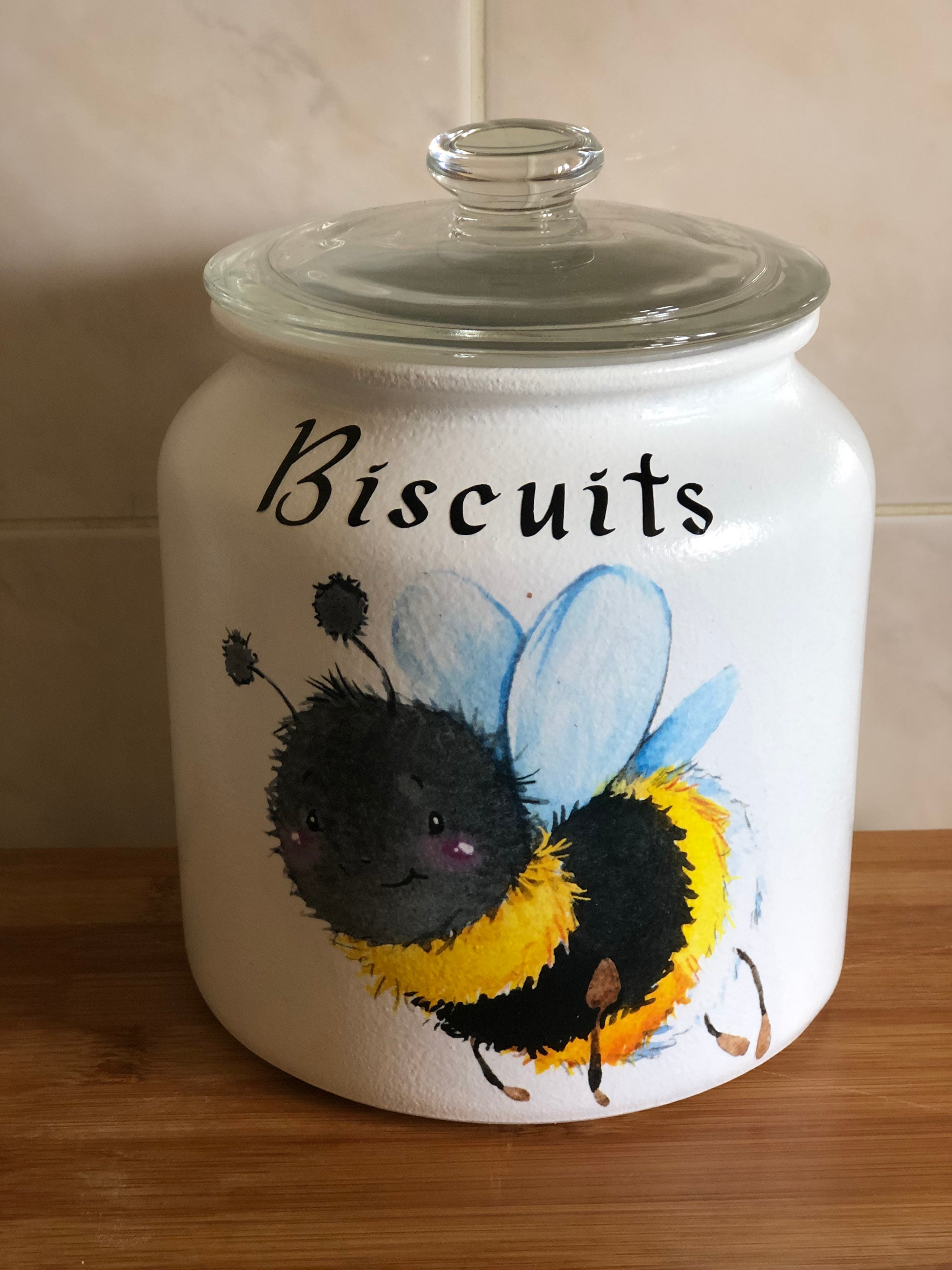 Made to order biscuit jar. They are painted white, decoupaged with this cute bee design, and sealed ...