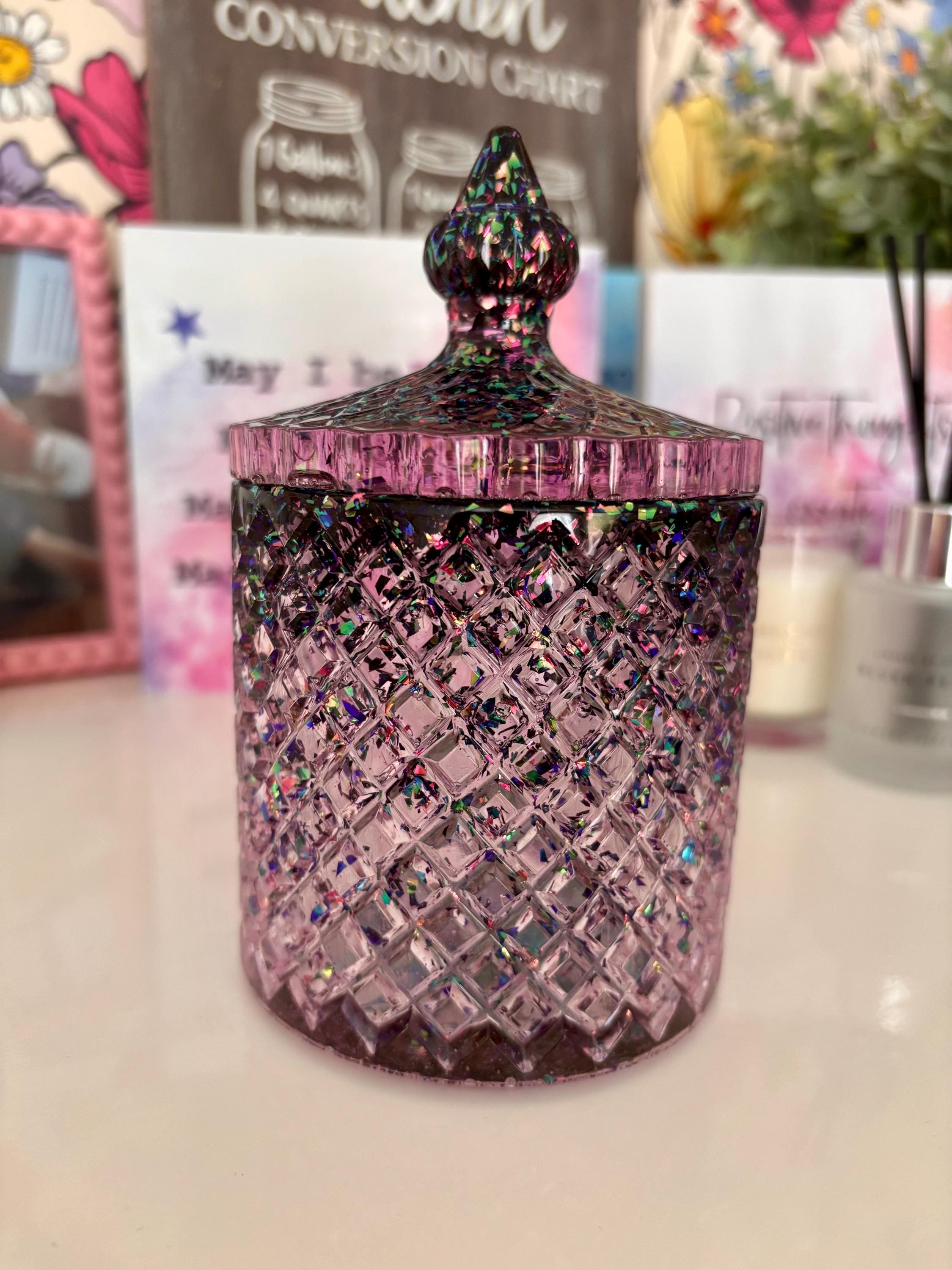 Handmade resin jar with lid made with epoxy resin and chameleon glitter flakes. Jar measures 27cm ar...