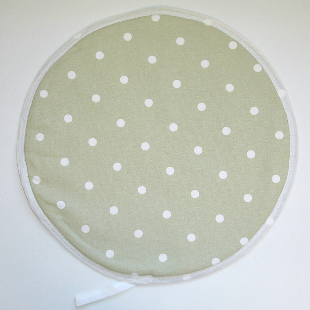 "A Hob Lid Cover For An Aga Range Cooker White Polka Dots on a Sage Green Background. Buy a sin...