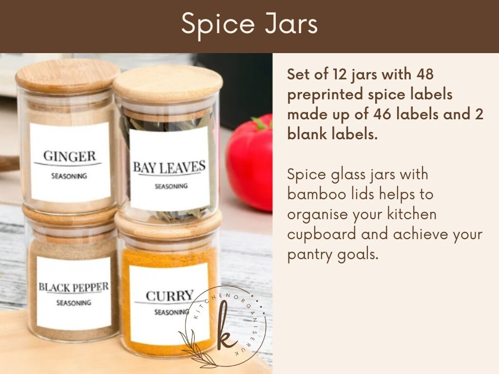 Spice jars with 48 Spice Labels preprinted GLASS SPICE JARS Kitchen Organiser - Set of 12 Glass Jars...