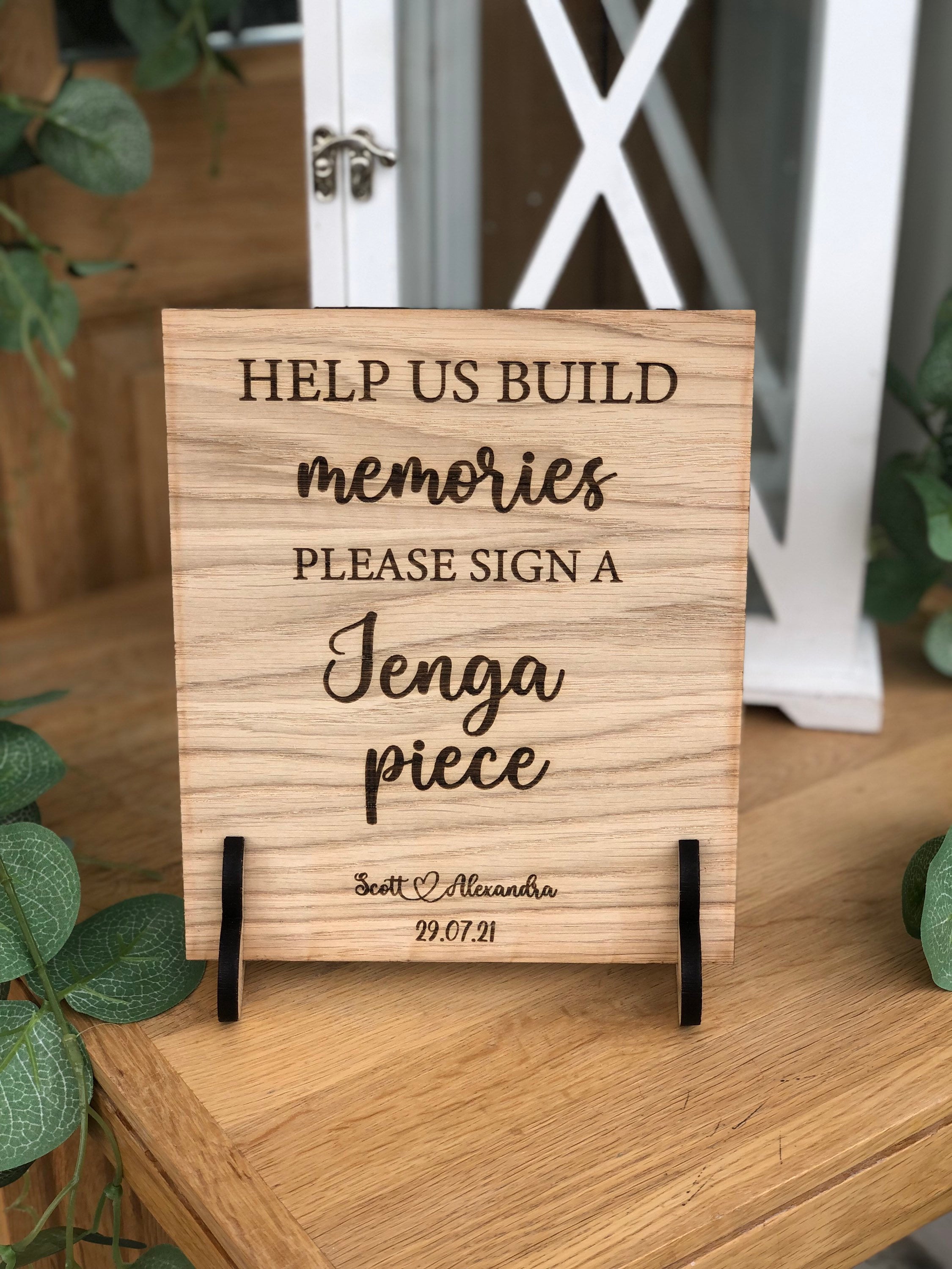 'Help Us Build Memories, Please Sign A Jenga Piece' Personalised Wedding Sign. This is a perfect sig...