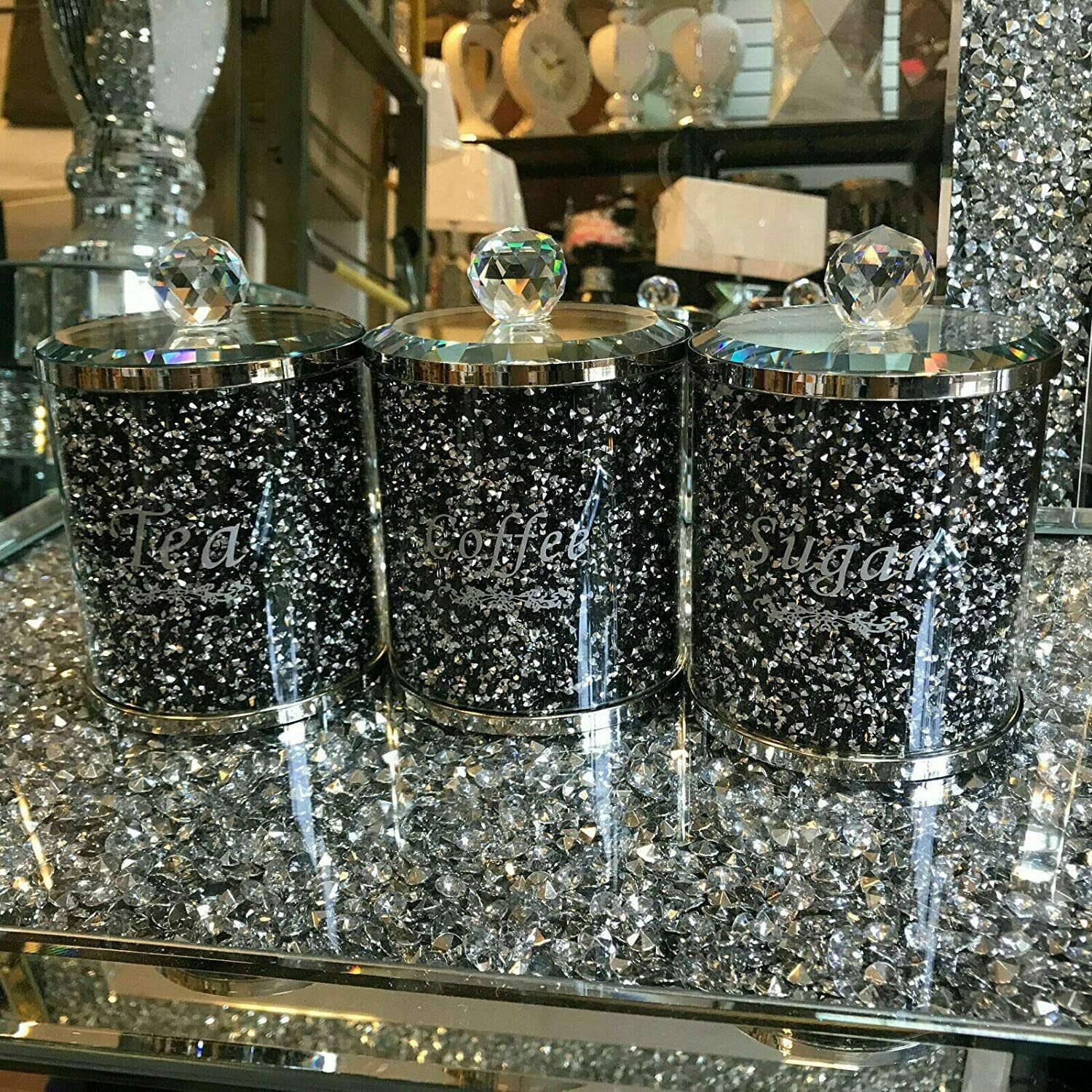 Black and silver Crushed Diamonds Crystal filled TEA SUGAR COFFEE C...