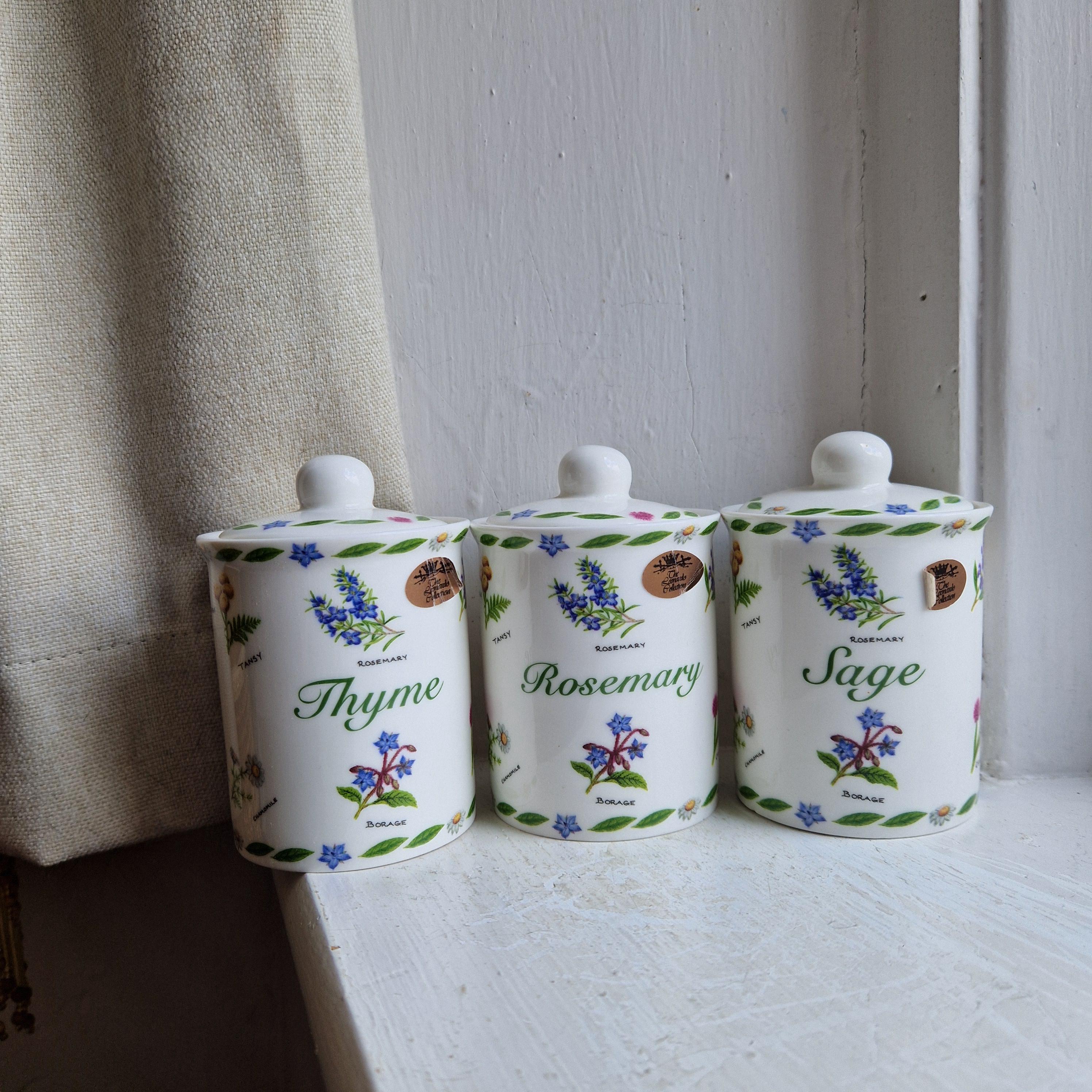 A lovely deadstock boxed trio of Leonardo Collection Herb Garden pattern lidded herb storage jars, R...