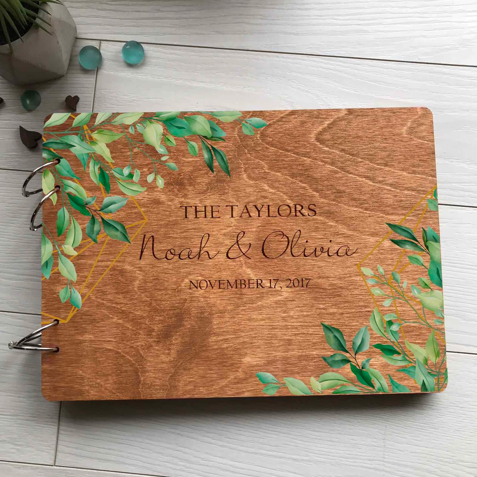 "Greenery Wedding Guest Book with Green Foliage Eucalyptus Wedding Wooden Wish Book Bright prin...