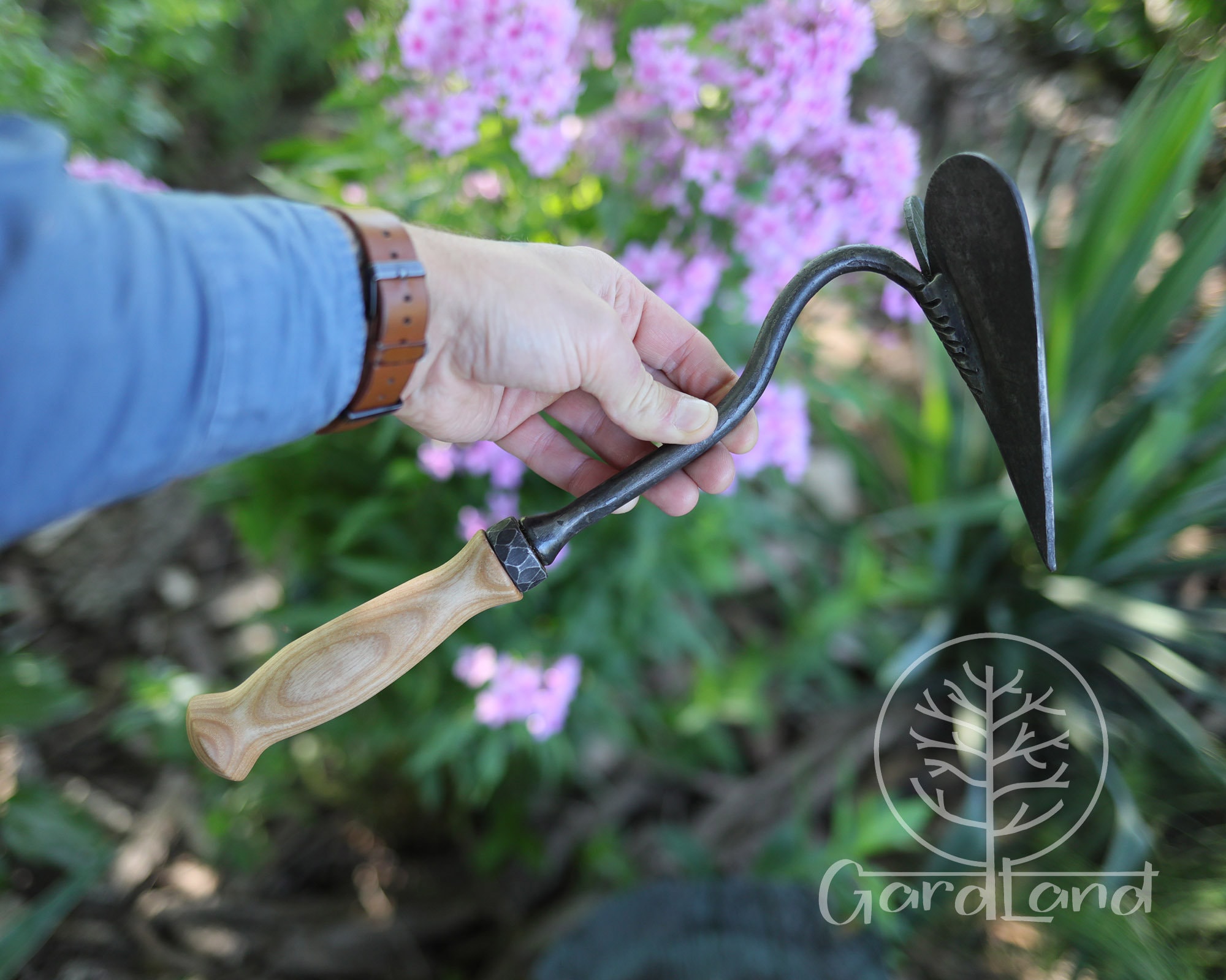A handmade forged hand plow, one of the most useful home garden weeding tools a gardener can own. Gr...