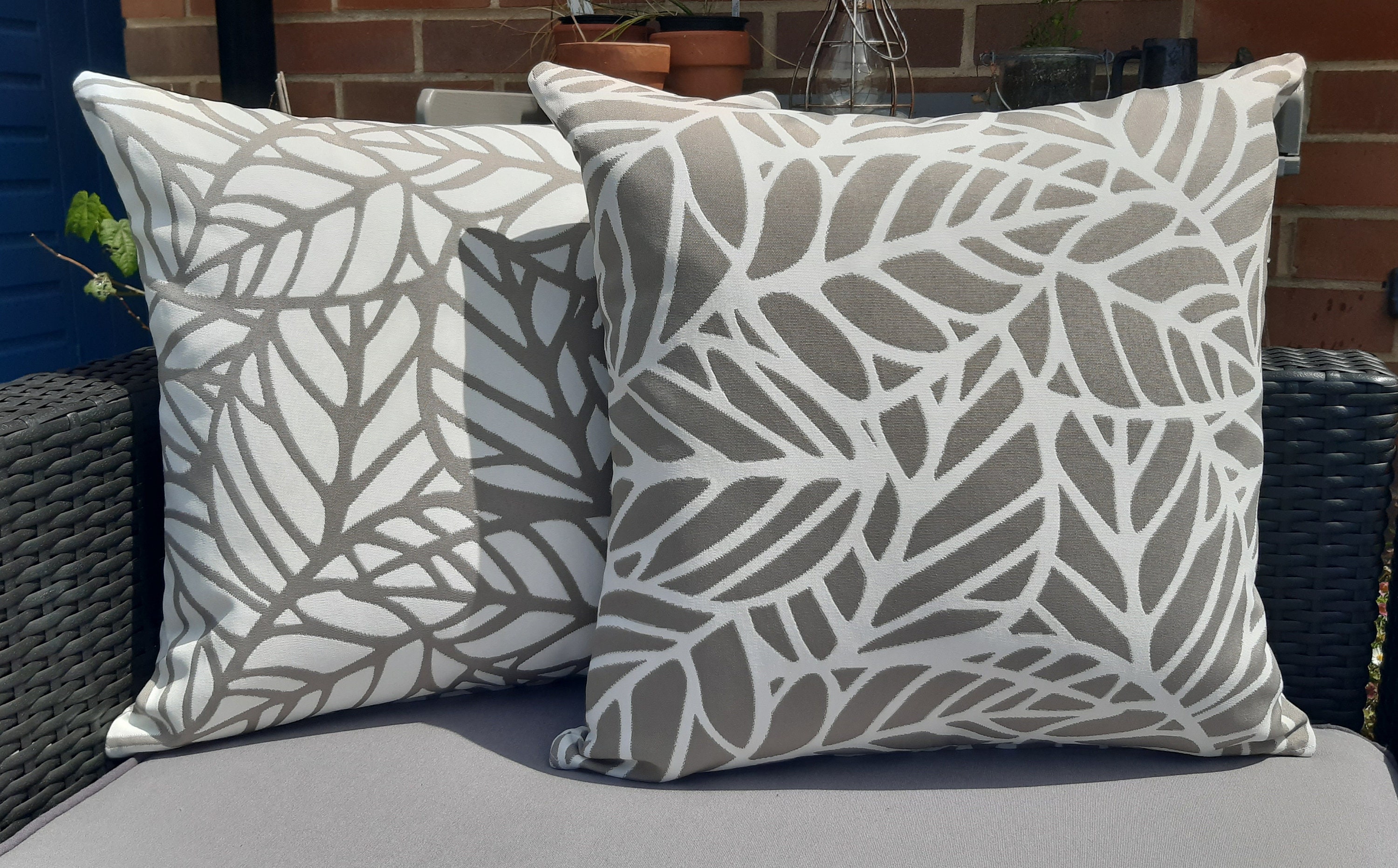 Beautiful handmade weatherproof outdoor cushions in an stone grey leaf print. Handmade by Sew Origin...