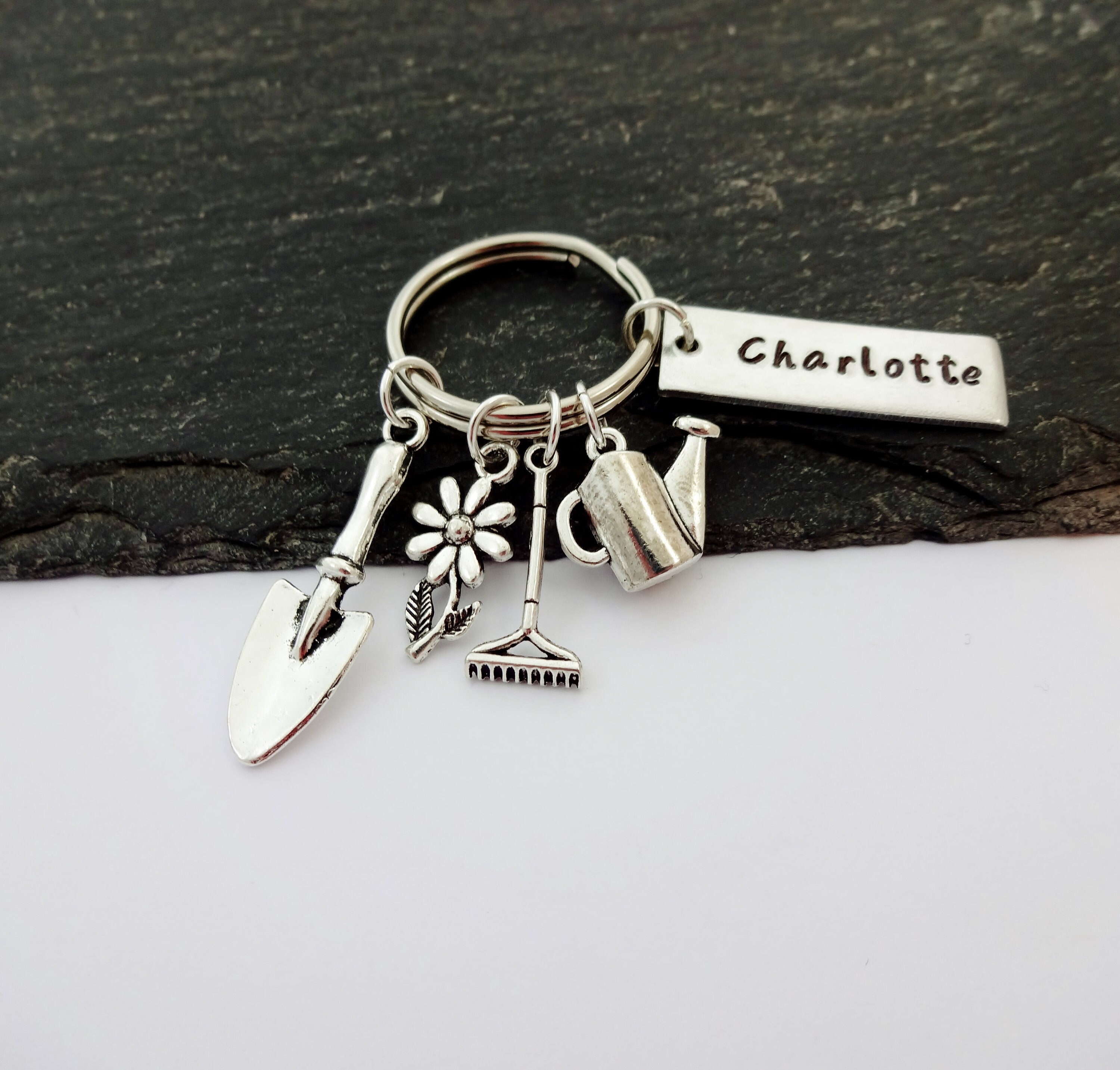 "Personalised Gardening Keyring Silver tone Flower and Spade charms featured on silver plated k...