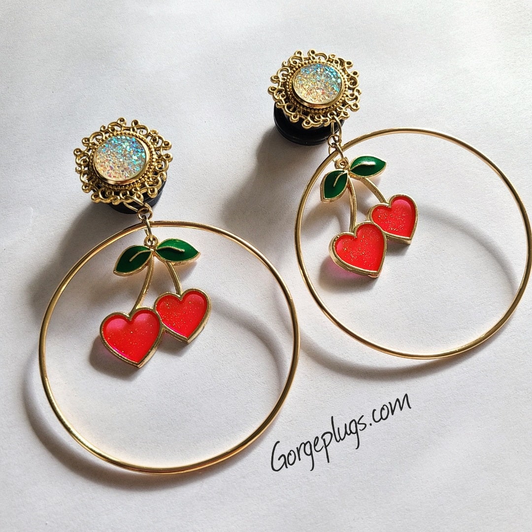 "0g-1\" Gold Cherry Hearts Hoop Dangle Plugs Gauges (8mm-...