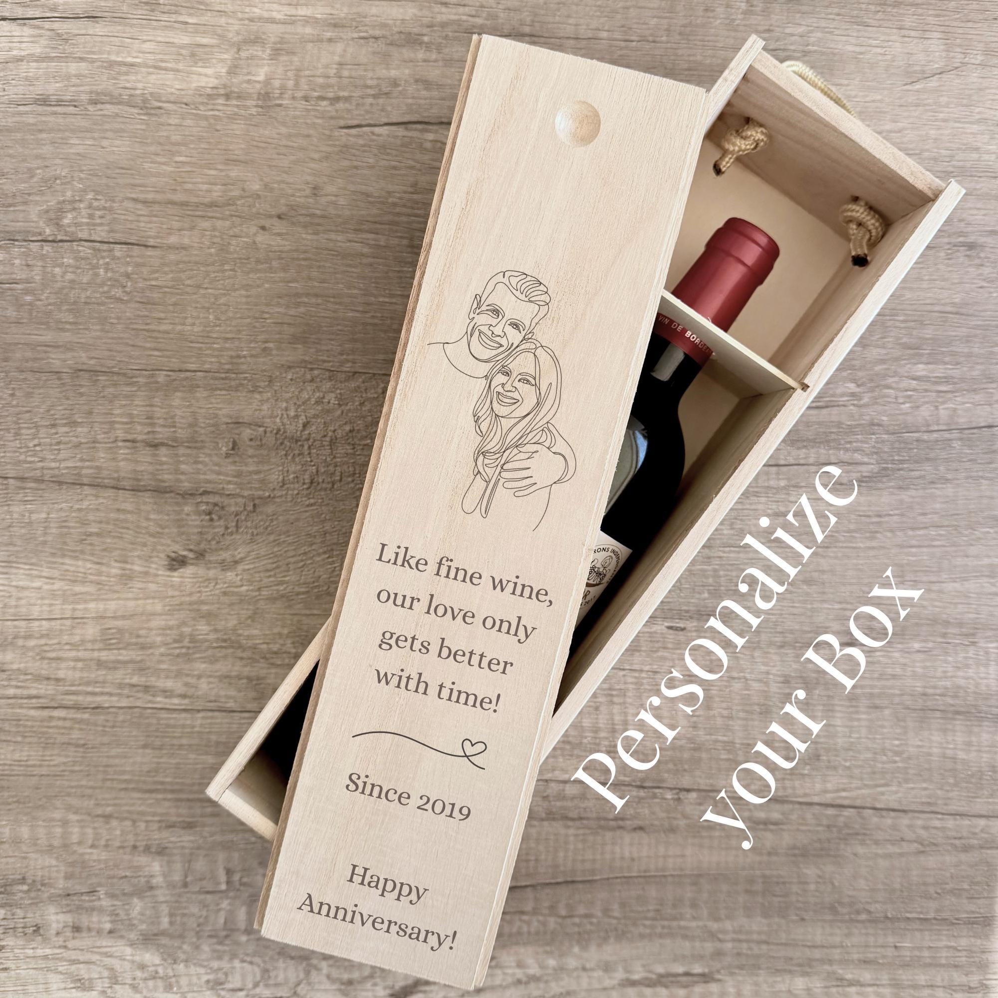 "Celebrate love and create lasting memories with this personalized wooden wine box - the perfec...