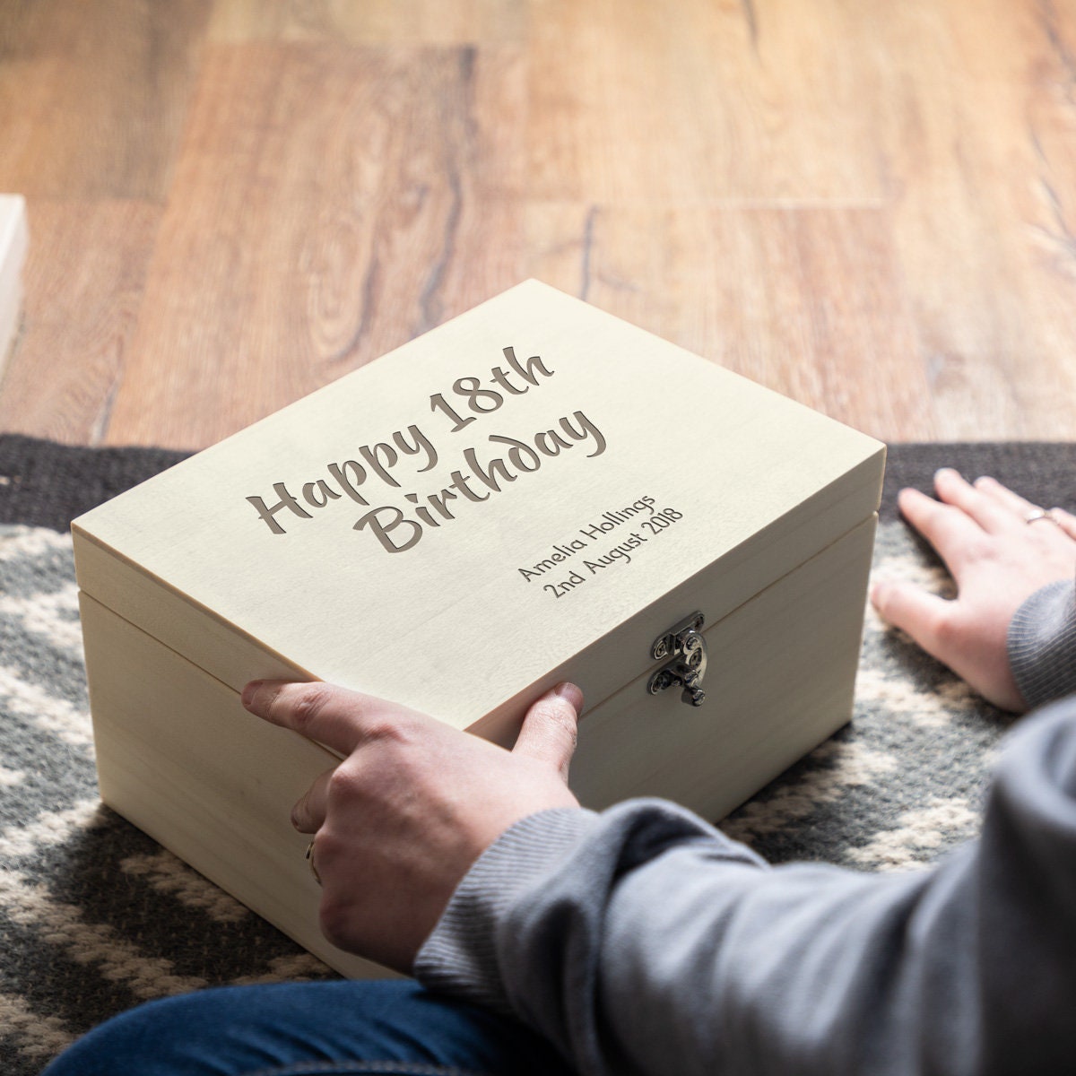 "This personalised wooden birthday keepsake box features laser-engraved text which says \"...