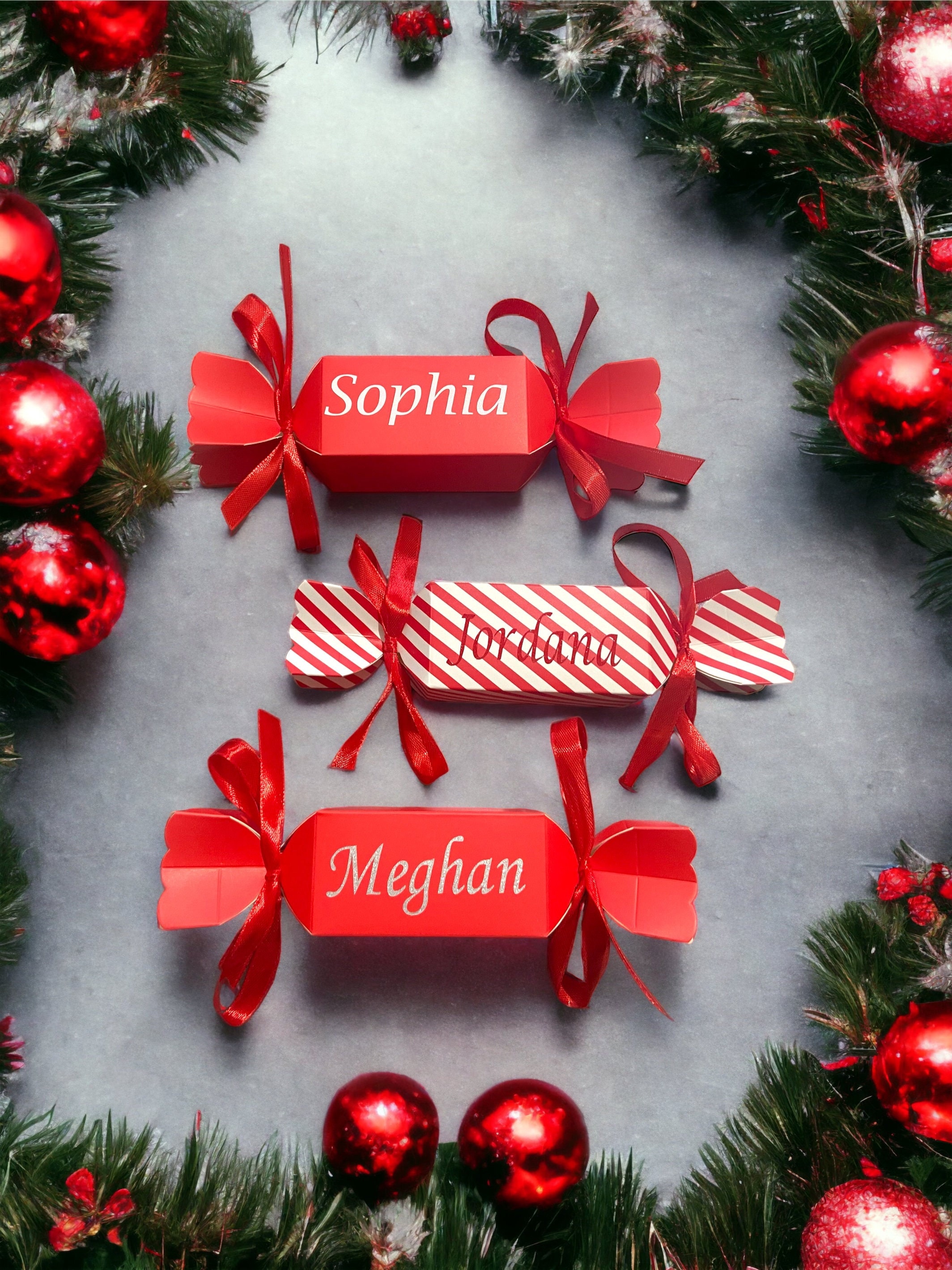 Red and white Christmas crackers personalised with a name (text approx. 2-2,5 cm tall) made with vin...