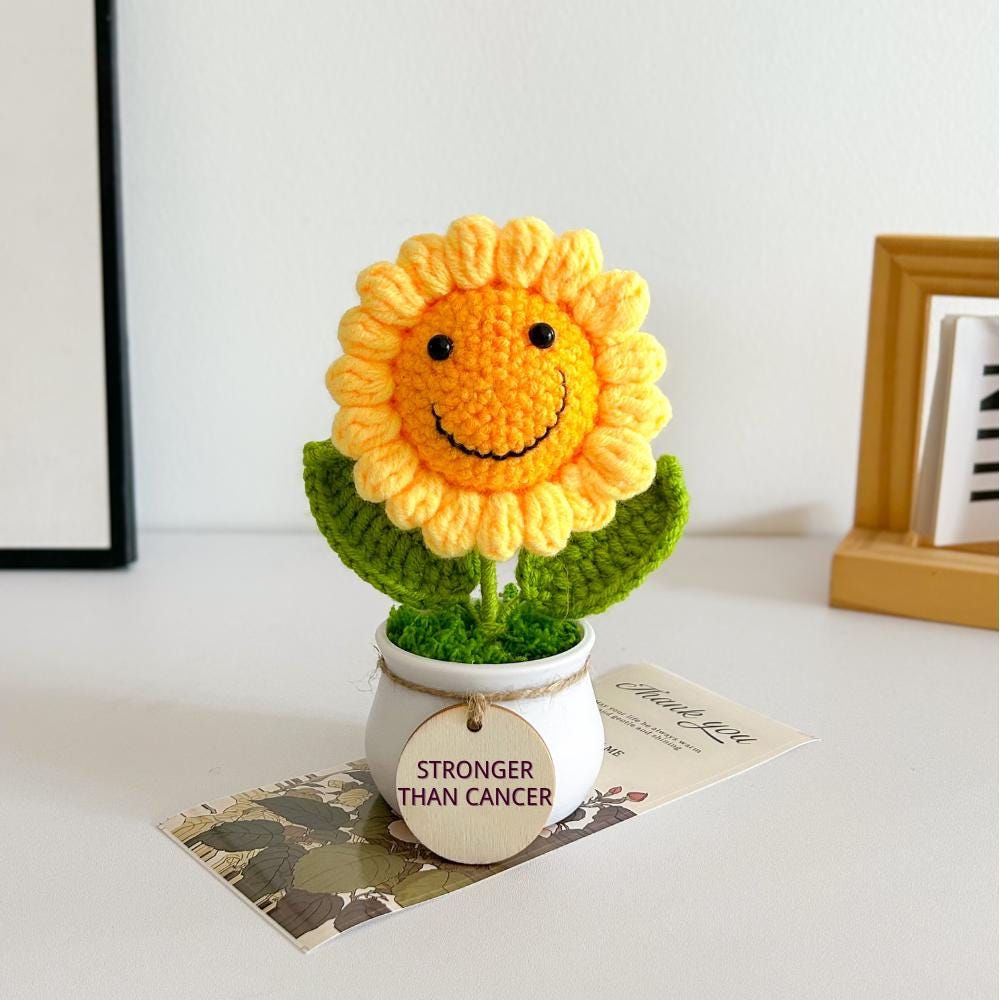 "\"This cancer care package features a beautifully handmade crochet flower in a pot, symbo...