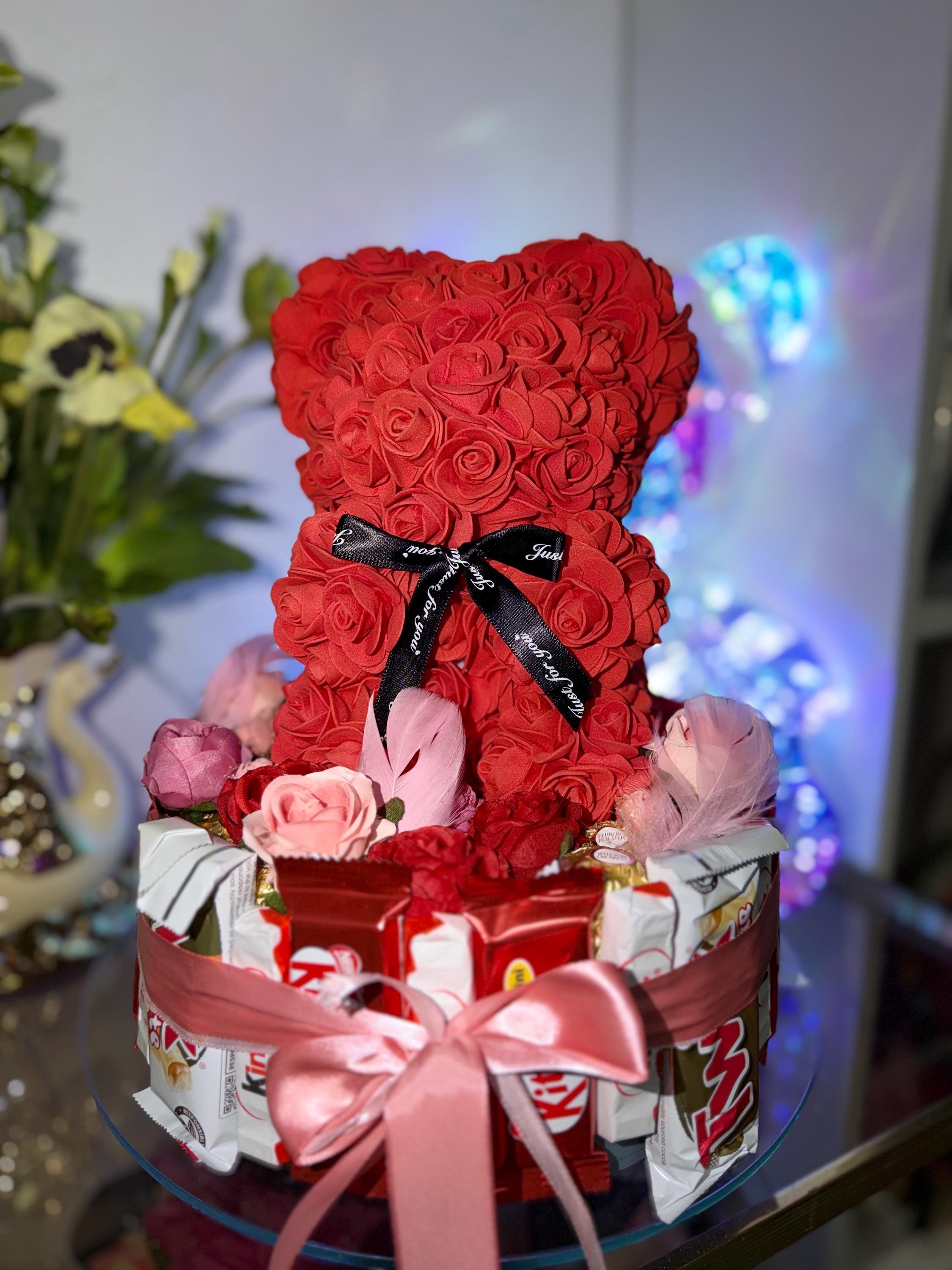 Handcrafted gift set with a decorative rose bear and fine sweets, designed as a loving surprise for ...