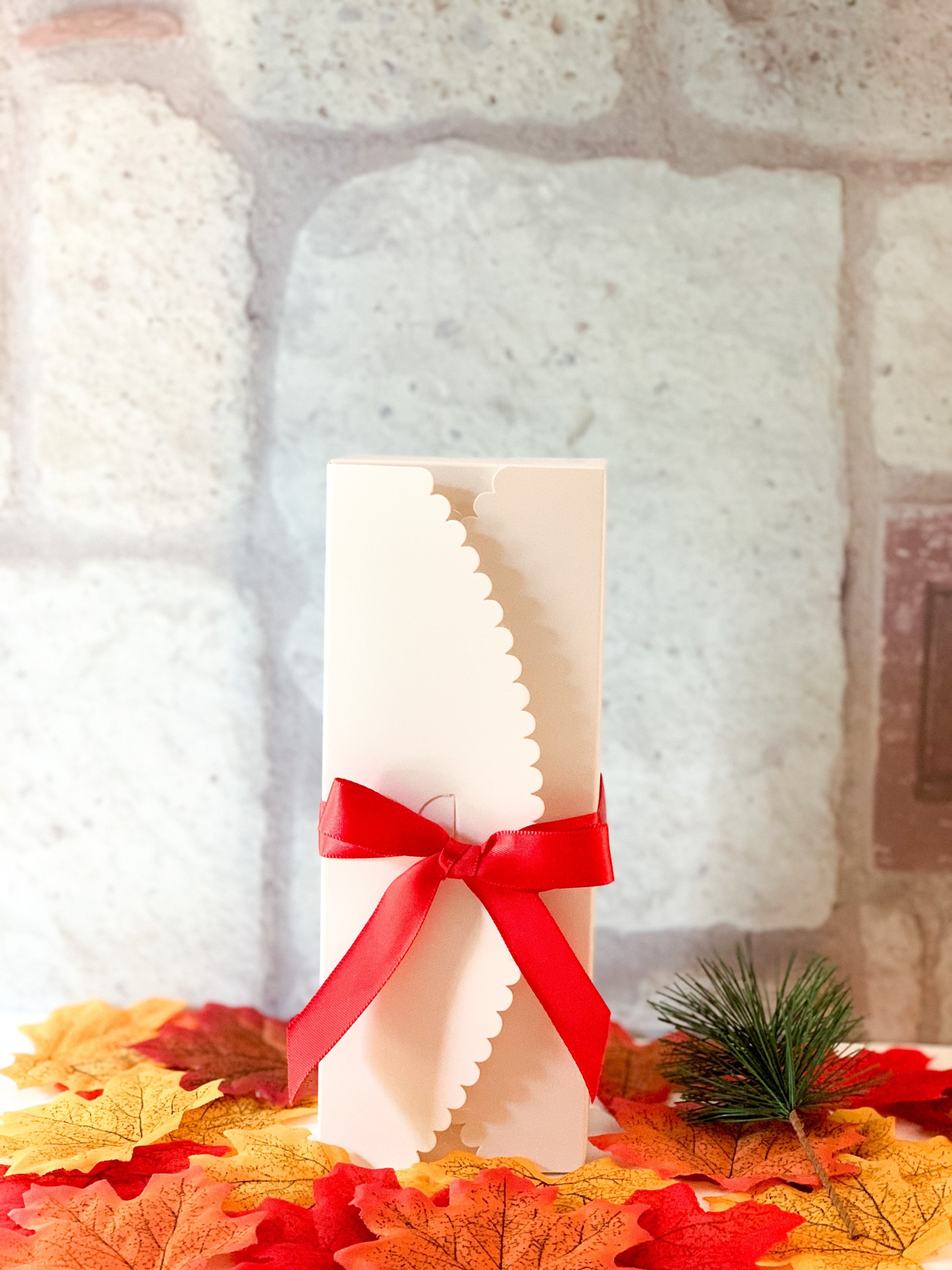 10 Small Scalloped White Boxes with Red Satin Ribbons, Holiday Gift...