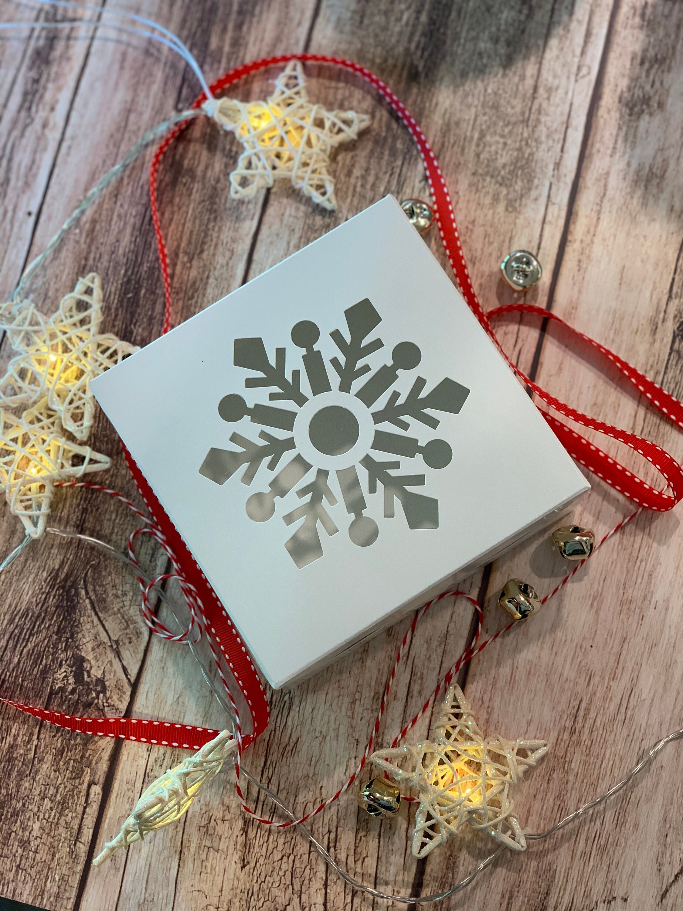 5 pcs Set of Snowflakes White Boxes, Jingle Bells, Red Ribbon for G...