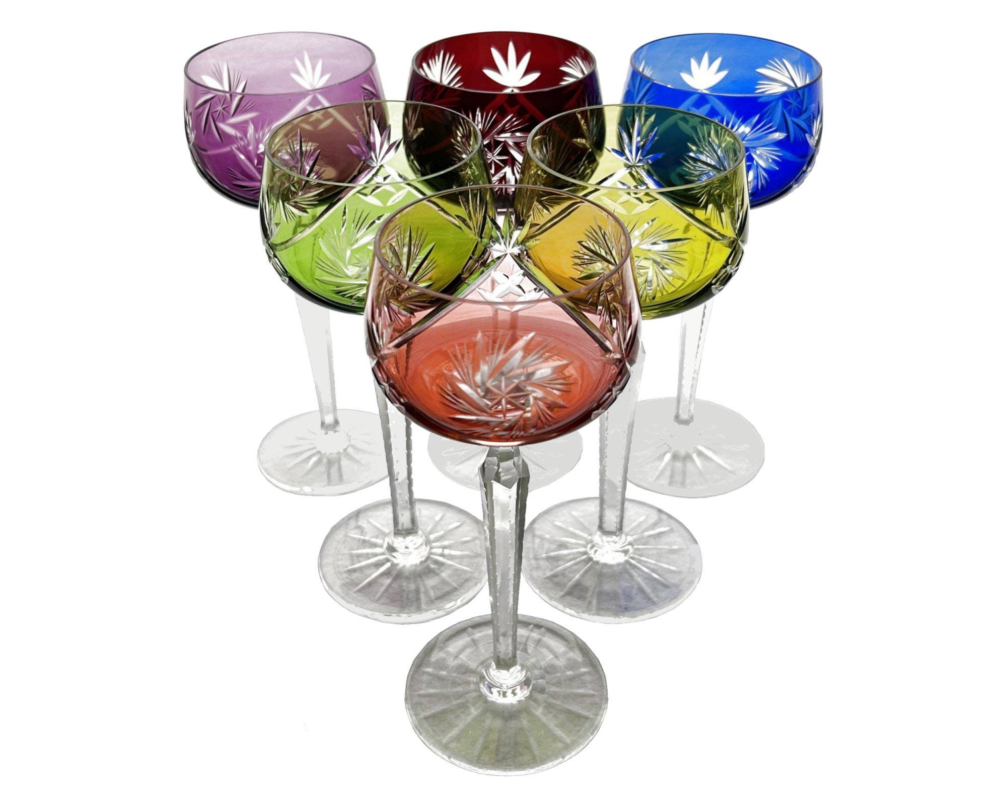 Antique Set of 6 RAINBOW HARLEQUIN Wine Glasses Goblets Hocks Cut-t...