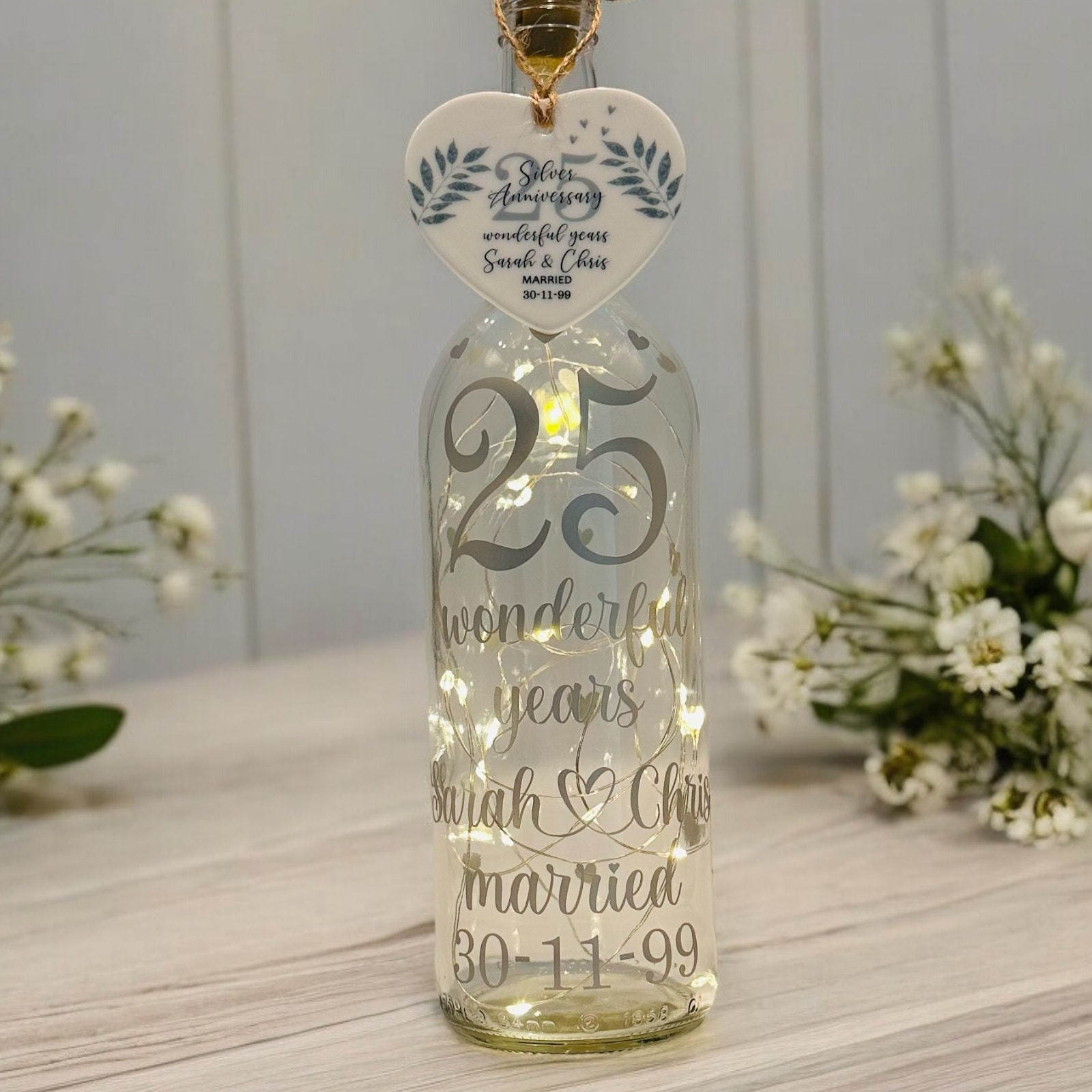 This beautiful personalised light up 25th Anniversary glass wine bottle, is the perfect gift for you...