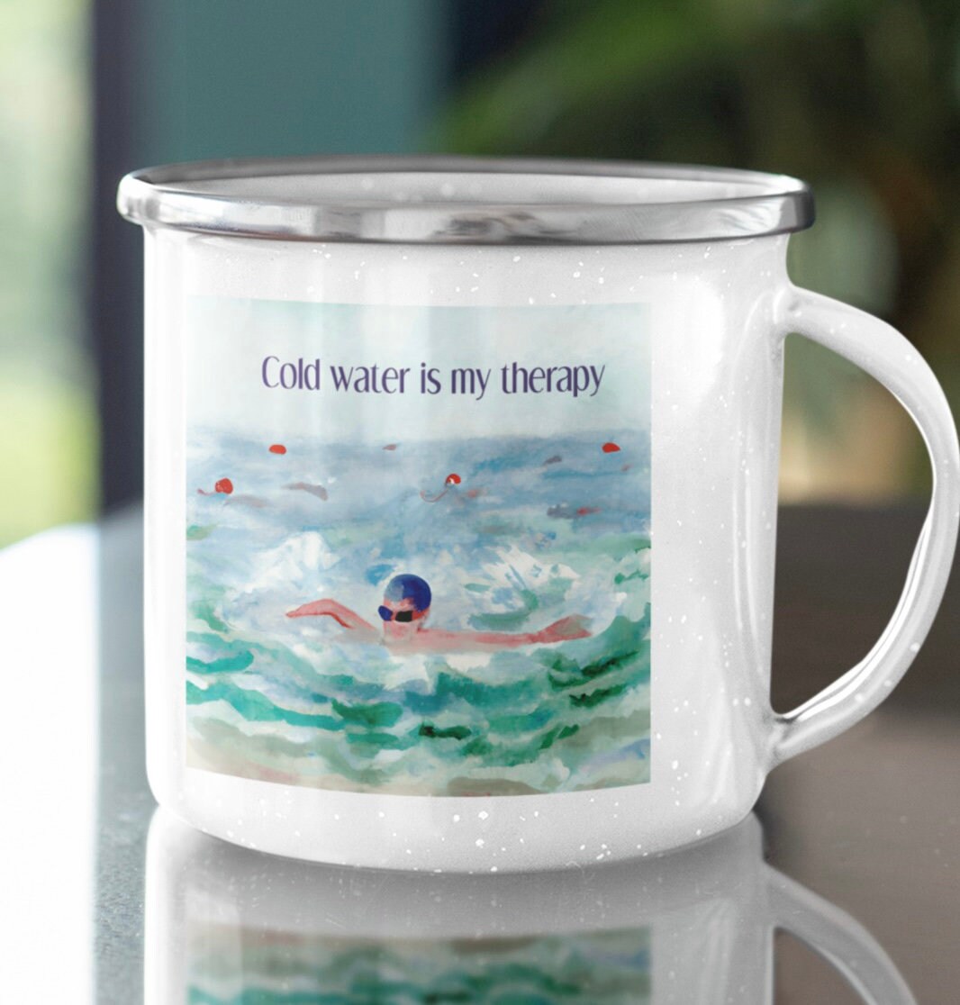 Cold Water Is My Therapy Enamel Mugs, any design, quotes and can be personalised. A great gift for o...