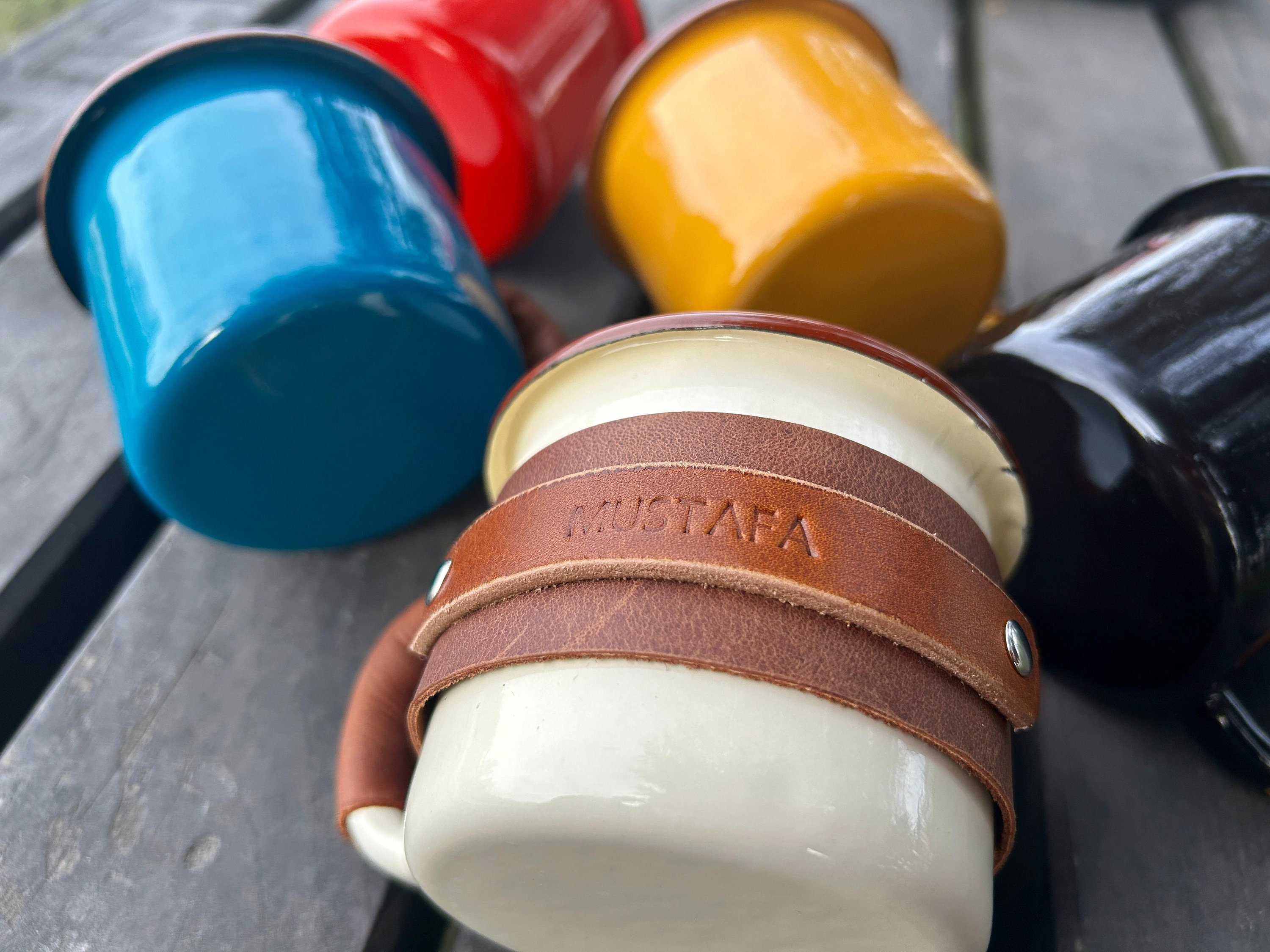 Personalized Enamel Mug, Leather Custom Enamel Mug, Camping Mug, Mu...