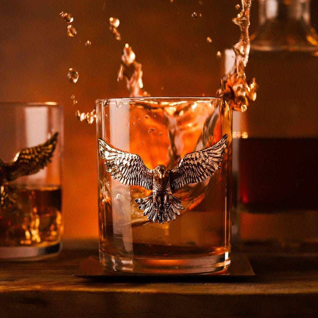 "Introducing our stunning Gold Eagle Whiskey Glasses Set, a timeless combination of elegance an...