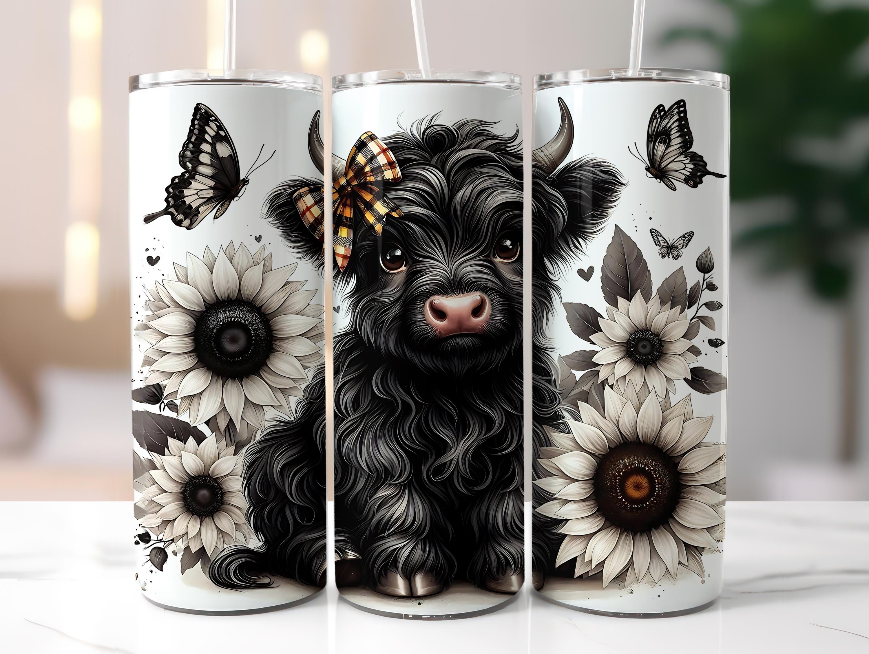 "Black and White Highland Cow Flower Tumbler Sublimation Design, Baby Highland Cow Sunflowers T...