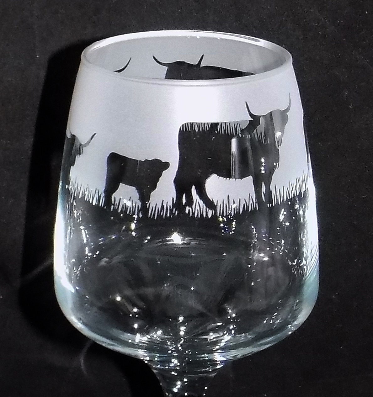 Hand etched 'HIGHLAND COW' wine glass with gift box (We have taken the photograph on a black backgro...