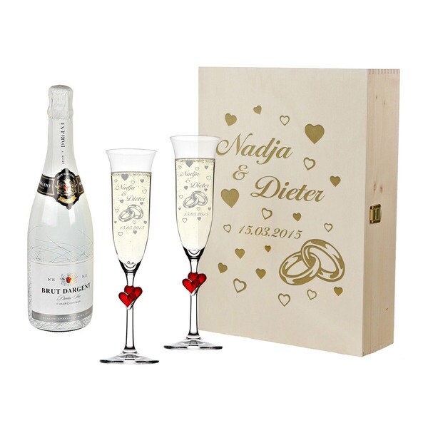 A unique four-piece sparkling wine gift set, consisting of two champagne flutes and a bottle of spar...