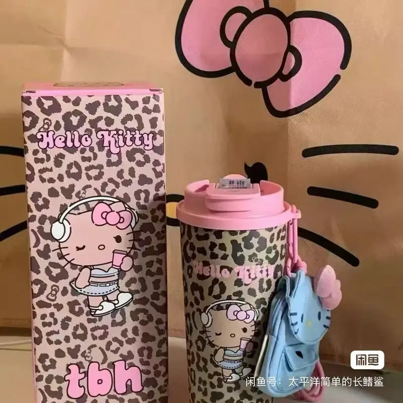 Hello Kitty Double Drink Coffee Cup Leopard Pattern Large Capacity Straw 473ml Stainless Steel Insul...