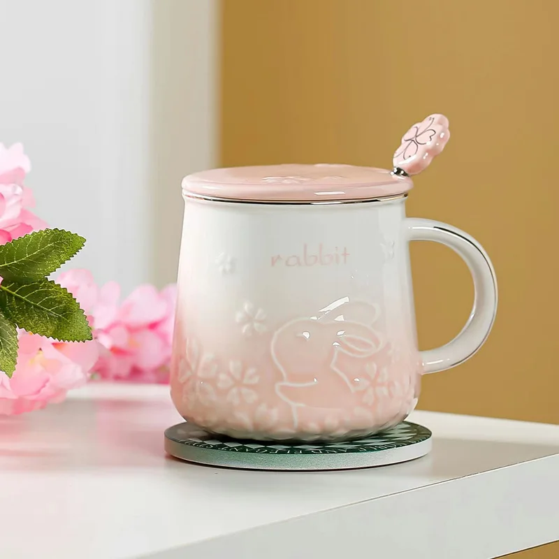 Cute Rabbit Pattern Ceramic Coffee Cup, Cherry Blossom Mug, Breakfa...
