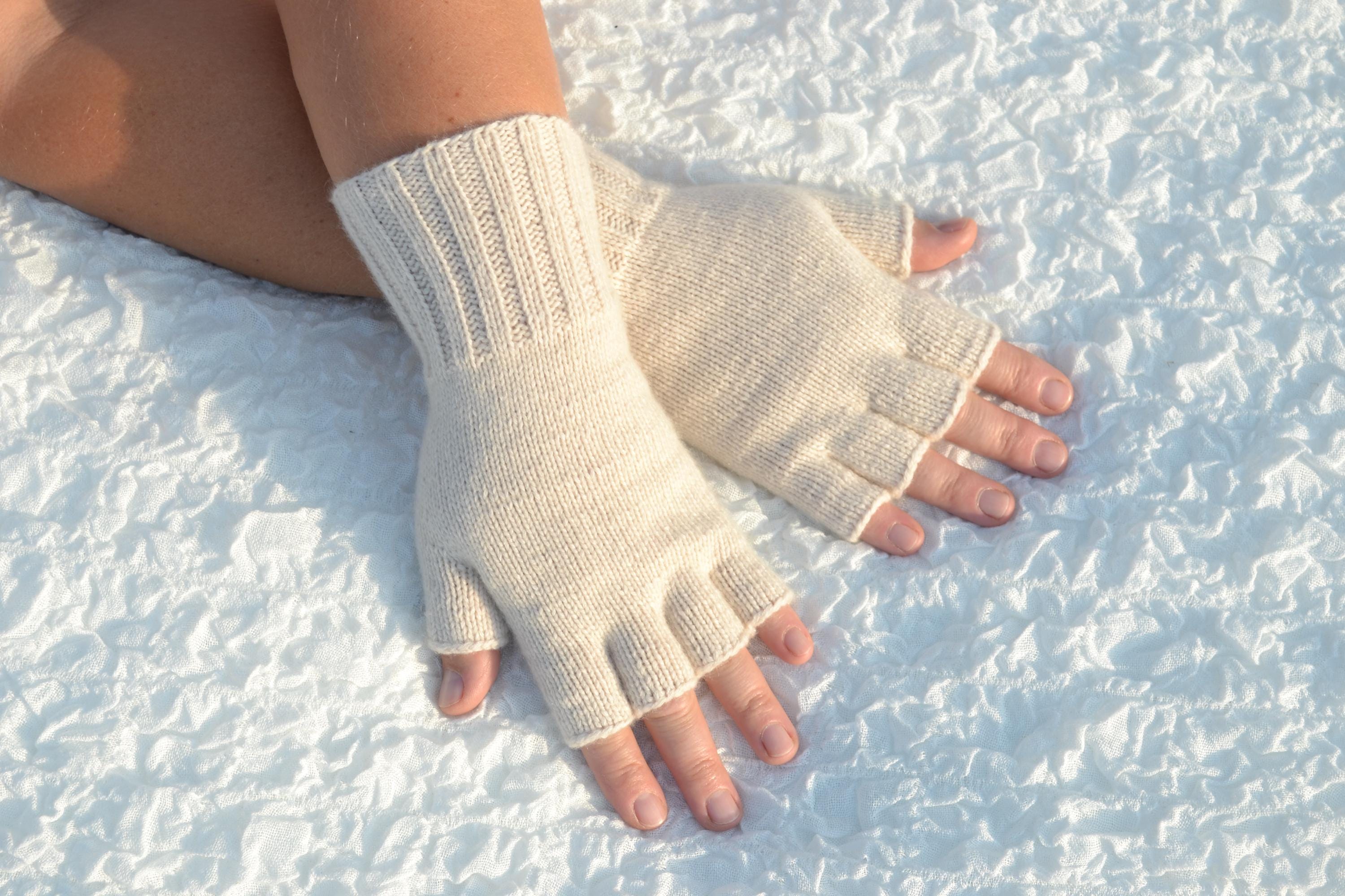 Off-white pure cashmere half finger gloves, hand knitted cashmere g...