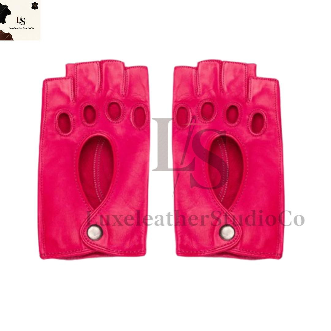 Pink leather fingerless gloves, Italian driving gloves for women, b...