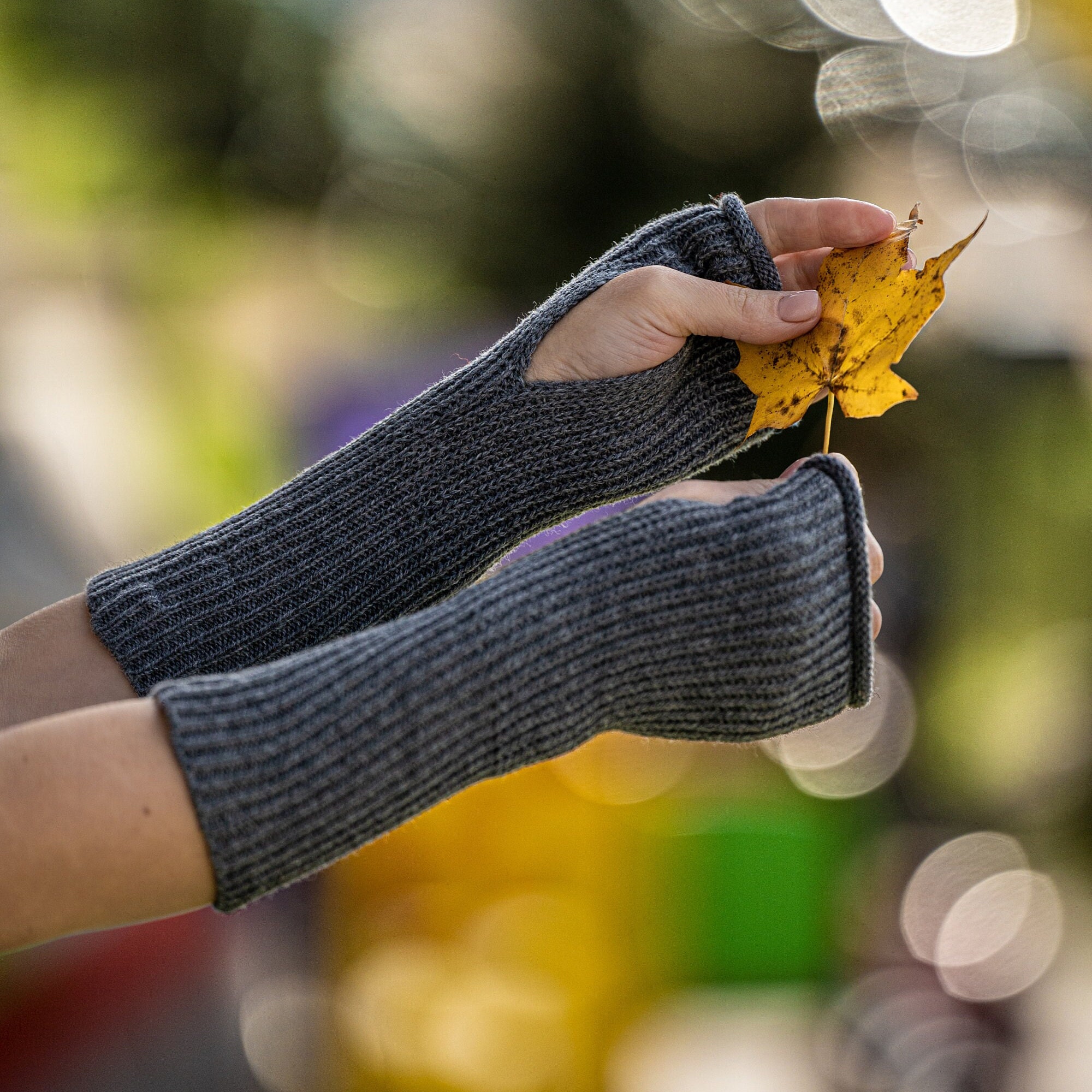 Grey cashmere fingerless gloves, knit wool wrist warmers, long glov...