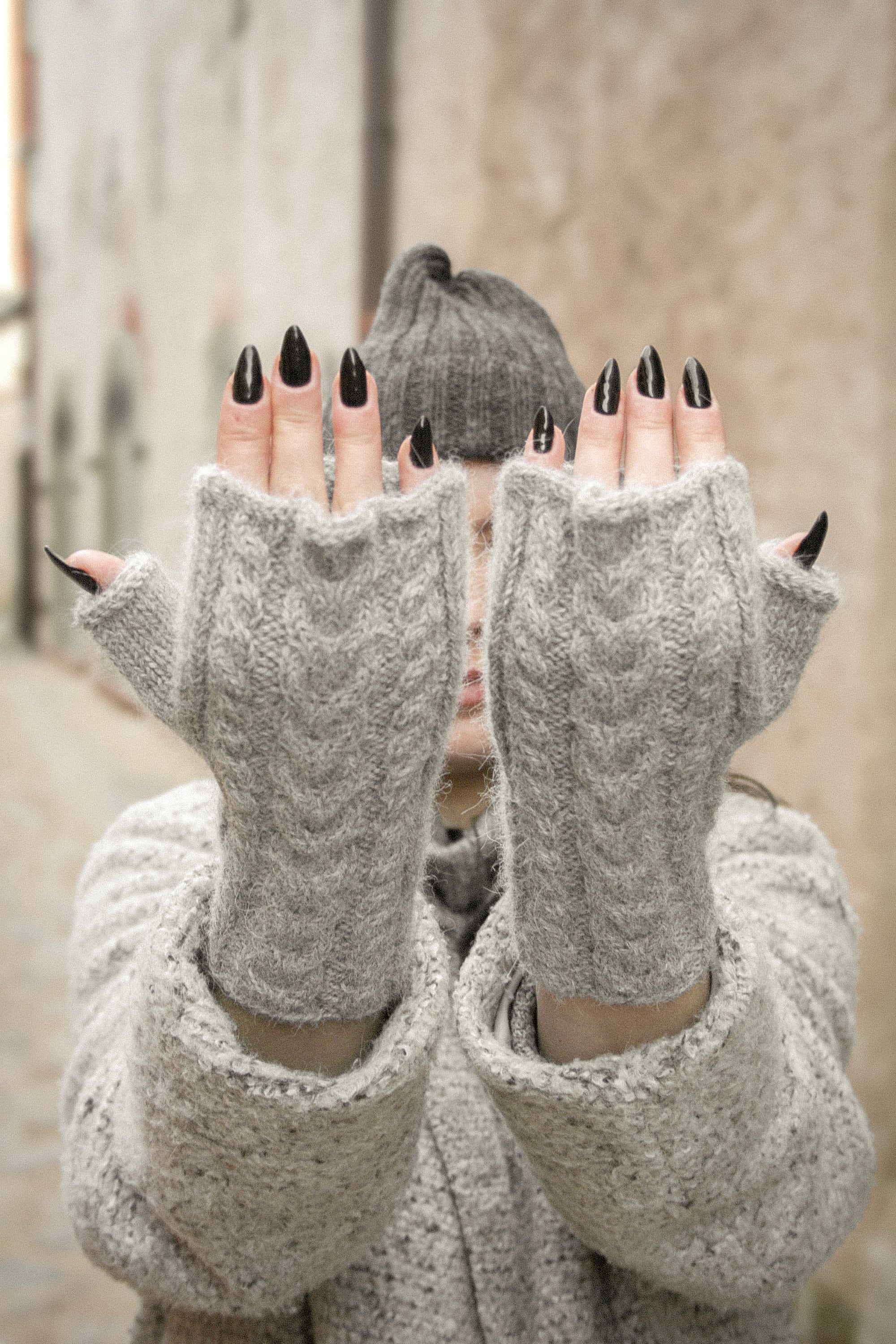 Charcoal alpaca half finger gloves, hand knitted grey gloves, alpac...