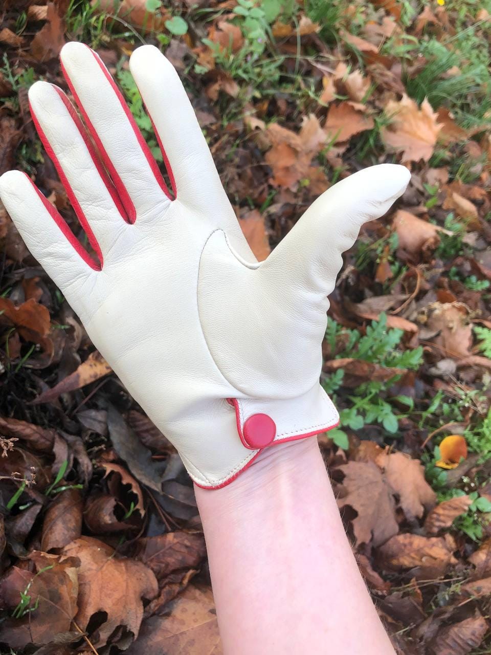 Ivory genuine leather women gloves, red accent short button gloves,...