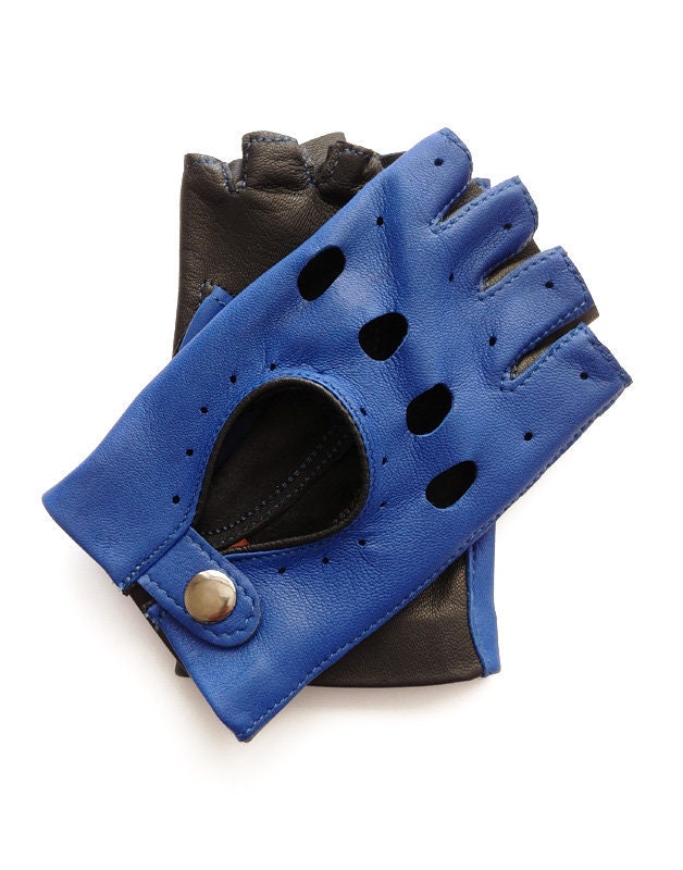 Black and blue fingerless ladies leather gloves, driving gloves, cy...