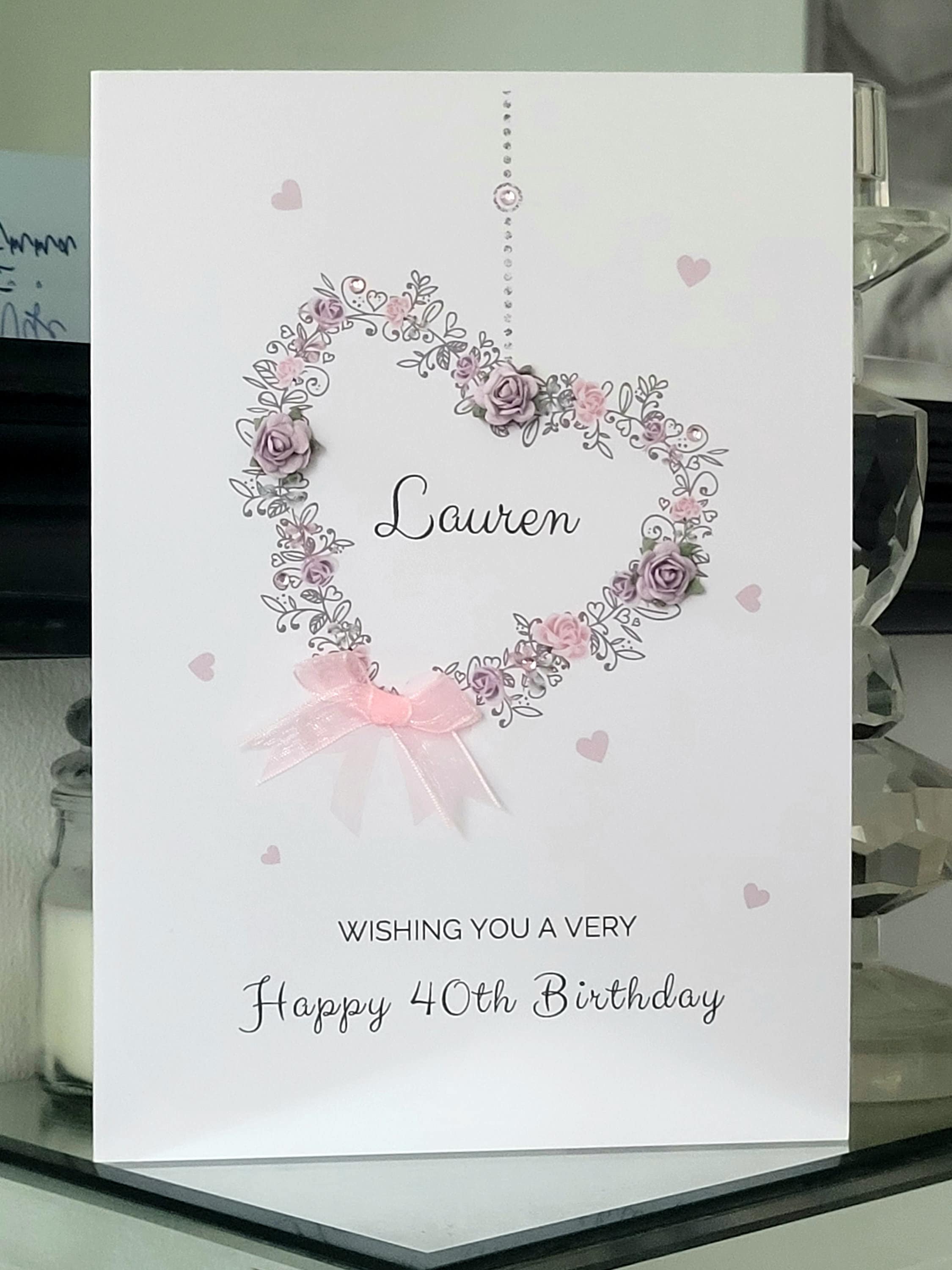 A personalised name 40th birthday card with a hanging heart decorated with 3d paper flowers, a pink ...
