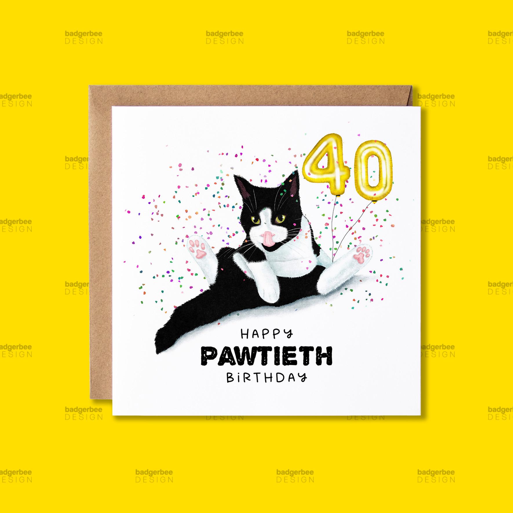 '40th Birthday Black and White Cat Happy Pawtieth Birthday' Card Blank inside for your own special m...