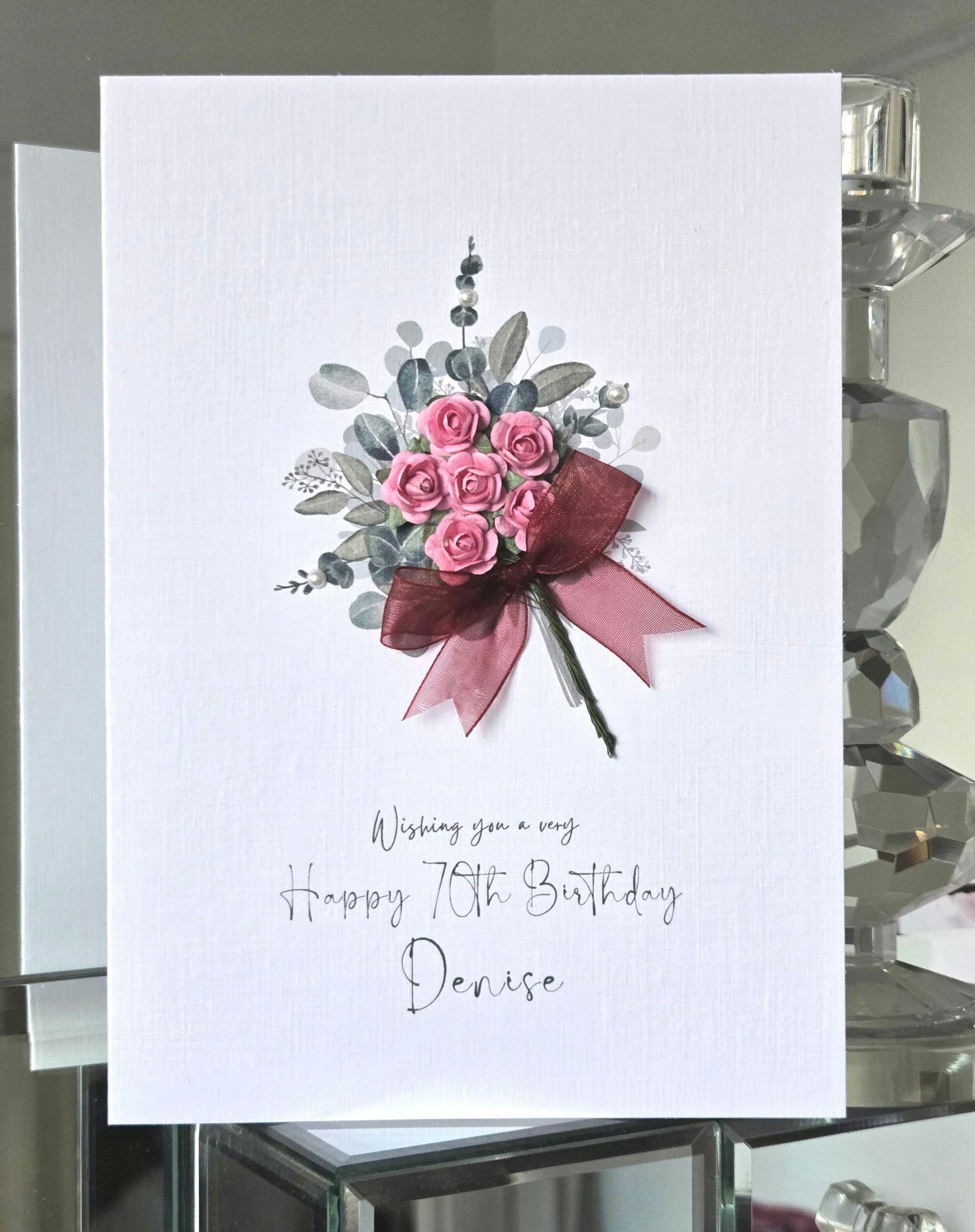 A special flower bouquet 70th birthday card for women featuring pink 3d paper flowers and burgundy o...