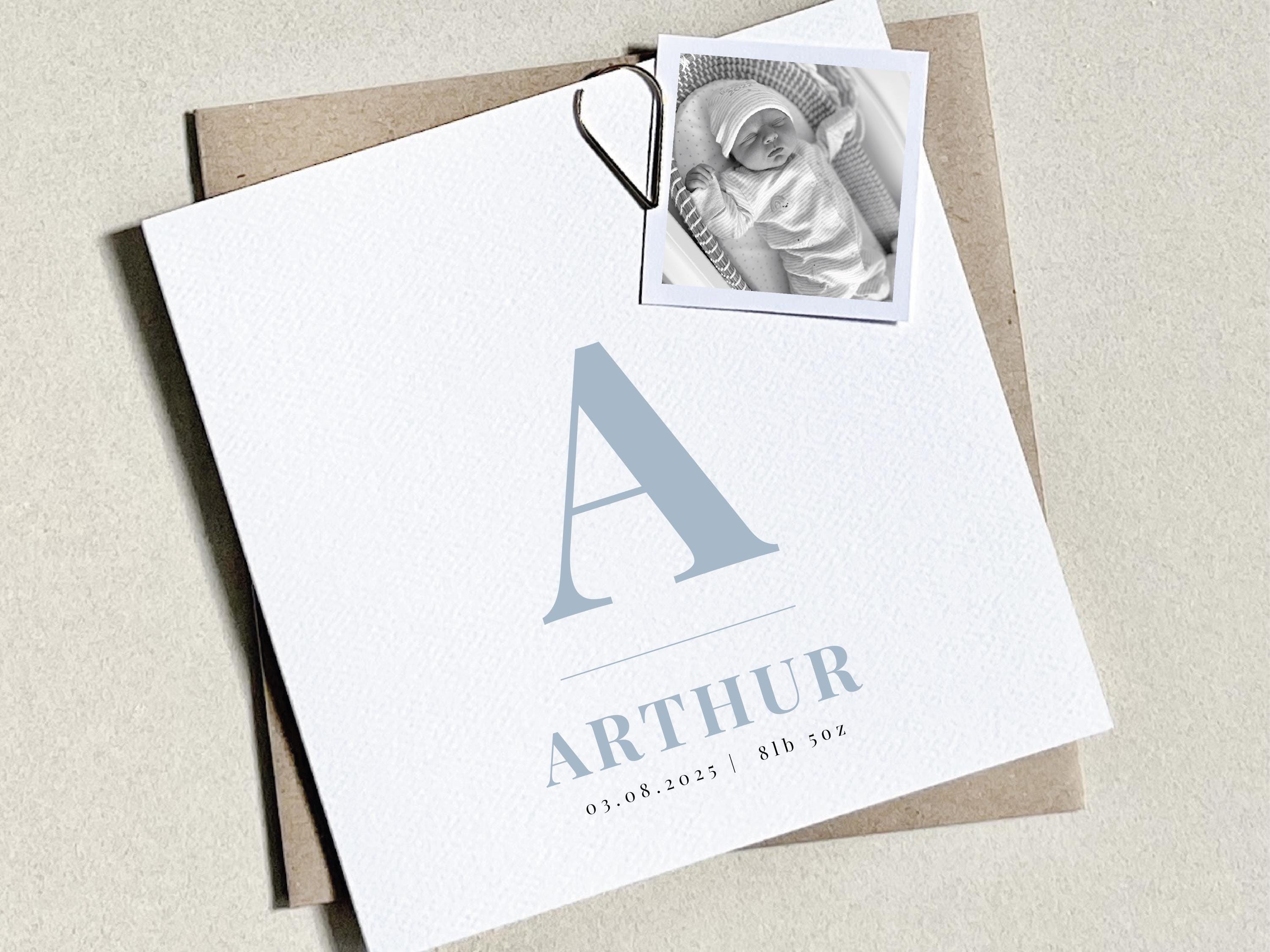 Welcome a precious new arrival with this personalised new baby card, featuring your chosen photo and...