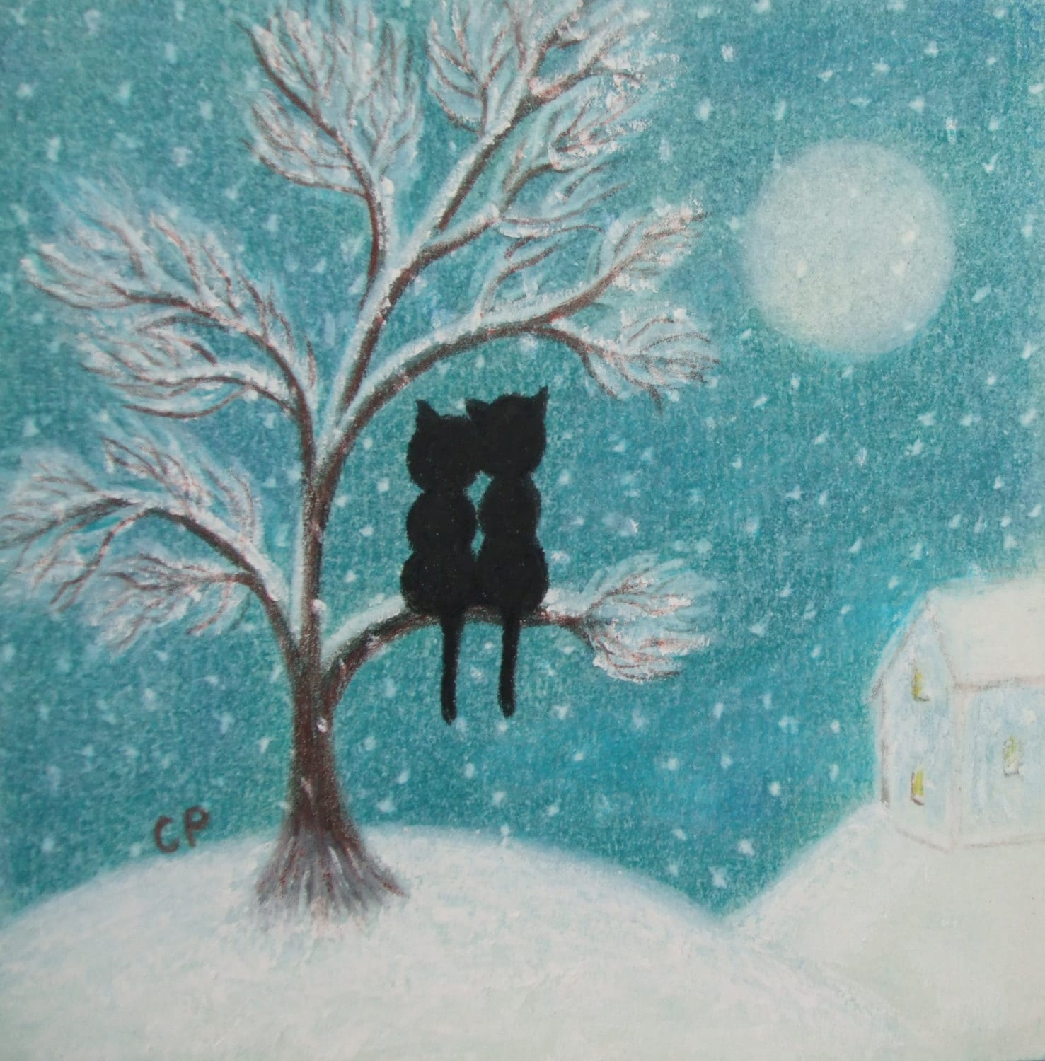 "Cat Christmas Card: Romantic Cats in Tree with Snow, Moon and House. Cards are handmade with p...